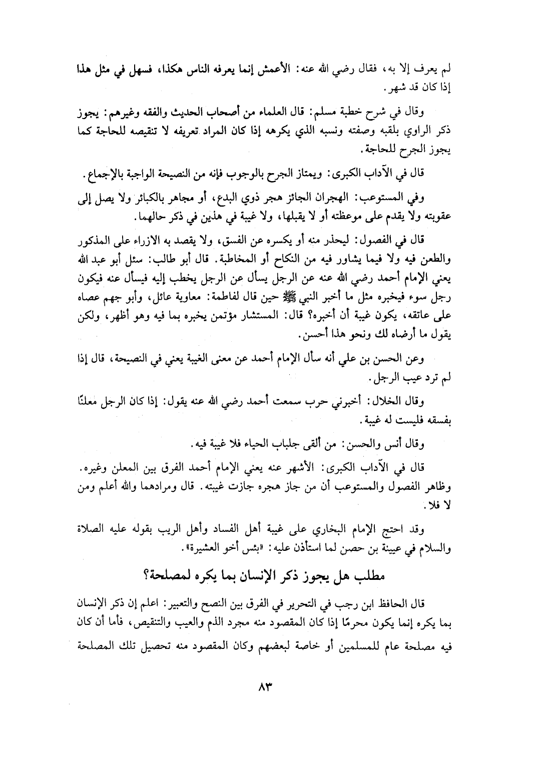 وَأَخْرَجَ الطَّبَرَانِيُّ بِإِسْنَادٍ رِجَالُهُ ثِقَاتٌ إلَّا أَبَا حَبِيبٍ الْعَبْقَرِيَّ وَيُقَالُ لَهُ الْغَنَوِيُّ فَقَالَ الْمُنْذِرِيُّ لَمْ أَقِفْ عَلَيْهِ، عَنْ مُعَاوِيَةَ بْنِ حَيْدَرَةَ - رَضِيَ اللَّهُ عَنْهُ - قَالَ: قَالَ رَسُولُ اللَّهِ - صَلَّى اللهُ عَلَيْهِ وَسَلَّمَ - «ثَلَاثَةٌ لَا تَرَى أَعْيُنُهُمْ النَّارَ: عَيْنٌ حَرَسَتْ فِي سَبِيلِ اللَّهِ، وَعَيْنٌ بَكَتْ مِنْ خَشْيَةِ اللَّهِ، وَعَيْنٌ كَفَّتْ عَنْ مَحَارِمِ اللَّهِ» . وَأَخْرَجَ الْإِمَامُ أَحْمَدُ وَابْنُ حِبَّانَ فِي صَحِيحِهِ وَالْحَاكِمُ وَقَالَ صَحِيحُ الْإِسْنَادِ وَاعْتَرَضَهُ الْمُنْذِرِيُّ عَنْ عُبَادَةَ بْنِ الصَّامِتِ - رَضِيَ اللَّهُ عَنْهُ - أَنَّ النَّبِيَّ - صَلَّى اللهُ عَلَيْهِ وَسَلَّمَ - قَالَ «اضْمَنُوا لِي سِتًّا مِنْ أَنْفُسِكُمْ أَضْمَنْ لَكُمْ الْجَنَّةَ، اُصْدُقُوا إذَا حَدَّثْتُمْ، وَأَوْفُوا إذَا وَعَدْتُمْ، وَأَدُّوا إذَا اُؤْتُمِنْتُمْ، وَاحْفَظُوا فُرُوجَكُمْ، وَغُضُّوا أَبْصَارَكُمْ، وَكُفُّوا أَيْدِيَكُمْ» .