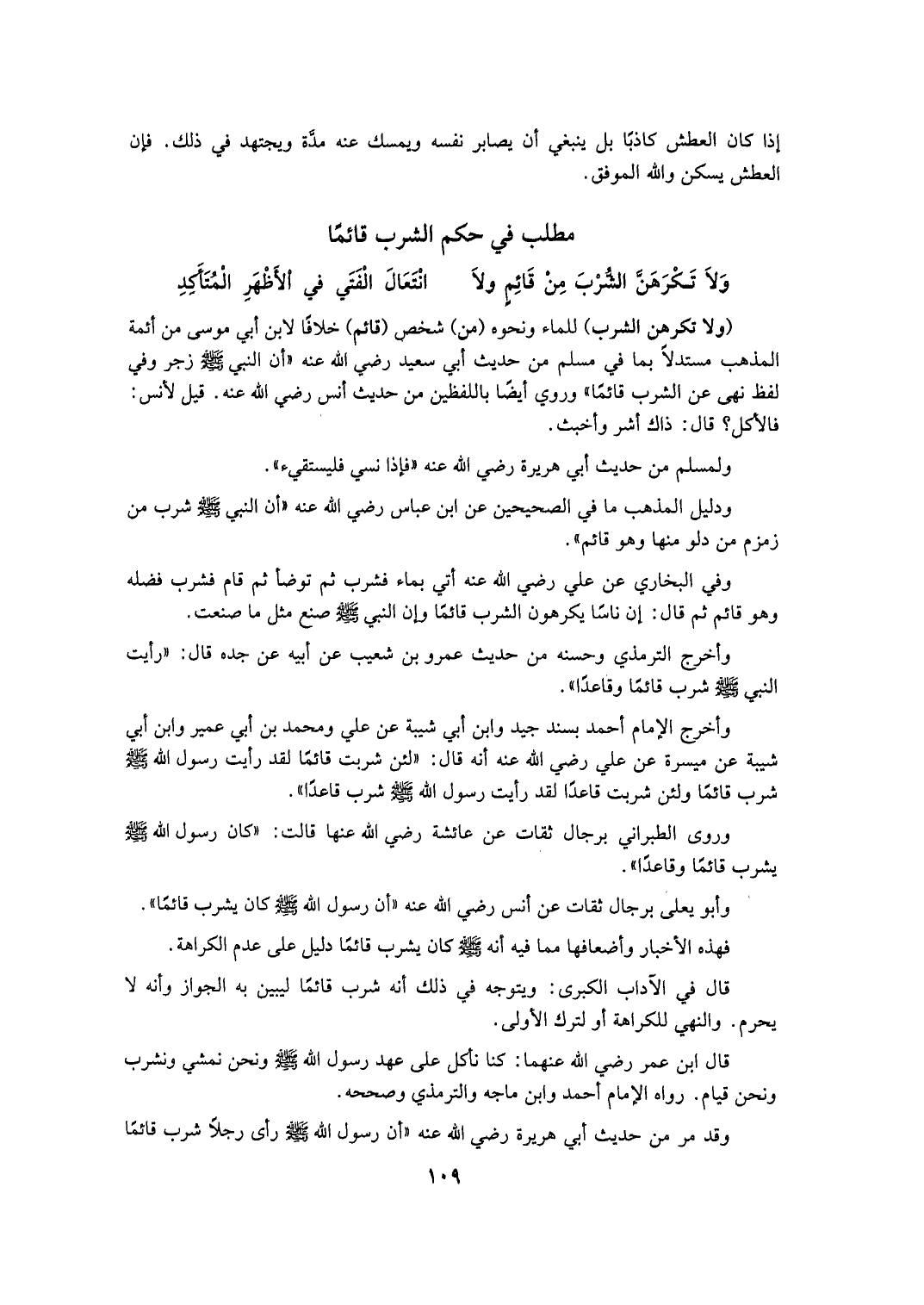 وَلَفْظُ ابْنِ مَاجَهْ «فَإِنْ غَلَبَتْ الْآدَمِيَّ فَثُلُثٌ لِلطَّعَامِ» الْحَدِيثَ وَأَخْرَجَ التِّرْمِذِيُّ وَحَسَّنَهُ وَابْنُ مَاجَهْ، وَالْبَيْهَقِيُّ عَنْ ابْنِ عُمَرَ - رَضِيَ اللَّهُ عَنْهُمَا - قَالَ: «تَجَشَّأَ رَجُلٌ عِنْدَ رَسُولِ اللَّهِ - صَلَّى اللهُ عَلَيْهِ وَسَلَّمَ - فَقَالَ كُفَّ عَنَّا جُشَاءَك، فَإِنَّ أَكْثَرَهُمْ شِبَعًا فِي الدُّنْيَا أَطْوَلُهُمْ جُوعًا يَوْمَ الْقِيَامَةِ» وَفِي صَحِيحِ الْحَاكِمِ أَنَّ الرَّجُلَ هُوَ أَبُو جُحَيْفَةَ. «فَعَنْ أَبِي جُحَيْفَةَ - رَضِيَ اللَّهُ عَنْهُ - قَالَ: أَكَلْت ثَرِيدَةً مِنْ خُبْزٍ وَلَحْمٍ، ثُمَّ أَتَيْت النَّبِيَّ - صَلَّى اللهُ عَلَيْهِ وَسَلَّمَ - فَجَعَلْت أَتَجَشَّأُ فَقَالَ: يَا هَذَا كُفَّ عَنَّا مِنْ جُشَائِك، فَإِنَّ أَكْثَرَ النَّاسِ شِبَعًا فِي الدُّنْيَا أَكْثَرُهُمْ جُوعًا يَوْمَ الْقِيَامَةِ» قَالَ الْحَاكِمُ صَحِيحُ الْإِسْنَادِ وَاعْتَرَضَهُ الْحَافِظُ الْمُنْذِرِيُّ، ثُمَّ قَالَ لَكِنْ رَوَاهُ الْبَزَّارُ بِإِسْنَادَيْنِ: أَحَدُهُمَا ثِقَاتٌ وَرَوَاهُ ابْنُ أَبِي الدُّنْيَا وَالطَّبَرَانِيُّ فِي الْكَبِيرِ، وَالْأَوْسَطِ، وَالْبَيْهَقِيُّ وَزَادَ «فَمَا أَكَلَ أَبُو جُحَيْفَةَ مِلْءَ بَطْنِهِ حَتَّى فَارَقَ الدُّنْيَا كَانَ إذَا تَغَدَّى لَا يَتَعَشَّى وَإِذَا تَعَشَّى لَا يَتَغَدَّى» .