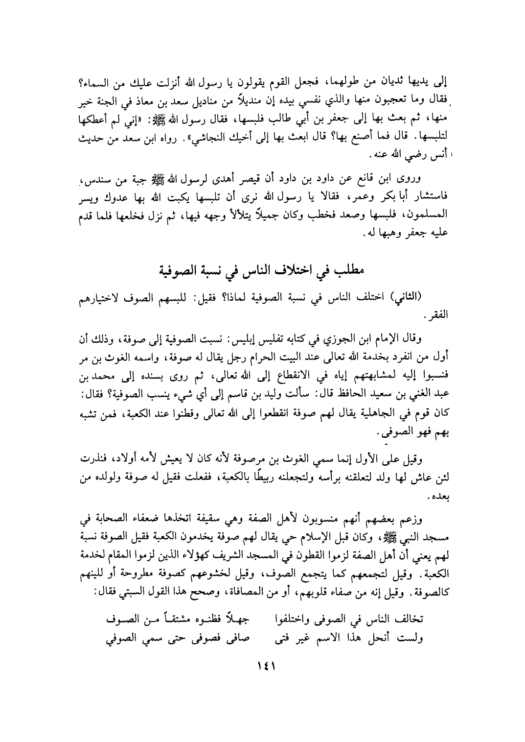 وَأَخْرَجَ الْإِمَامُ أَحْمَدُ بِسَنَدٍ جَيِّدٍ وَابْنُ أَبِي شَيْبَةَ عَنْ عَلِيٍّ وَمُحَمَّدِ بْنِ أَبِي عُمَيْرٍ وَابْنُ أَبِي شَيْبَةَ عَنْ مَيْسَرَةَ عَنْ «عَلِيٍّ - رَضِيَ اللَّهُ عَنْهُ - أَنَّهُ قَالَ لَئِنْ شَرِبْتُ قَائِمًا لَقَدْ رَأَيْتُ رَسُولَ اللَّهِ - صَلَّى اللهُ عَلَيْهِ وَسَلَّمَ - شَرِبَ قَائِمًا وَلَئِنْ شَرِبْت قَاعِدًا لَقَدْ رَأَيْتُ رَسُولَ اللَّهِ - صَلَّى اللهُ عَلَيْهِ وَسَلَّمَ - شَرِبَ قَاعِدًا» . وَرَوَى الطَّبَرَانِيُّ بِرِجَالٍ ثِقَاتٍ عَنْ عَائِشَةَ - رَضِيَ اللَّهُ عَنْهَا - قَالَتْ «كَانَ رَسُولُ اللَّهِ - صَلَّى اللهُ عَلَيْهِ وَسَلَّمَ - يَشْرَبُ قَائِمًا وَقَاعِدًا» . وَأَبُو يَعْلَى بِرِجَالٍ ثِقَاتٍ عَنْ أَنَسٍ - رَضِيَ اللَّهُ عَنْهُ - «أَنَّ رَسُولَ اللَّهِ كَانَ يَشْرَبُ قَائِمًا» .