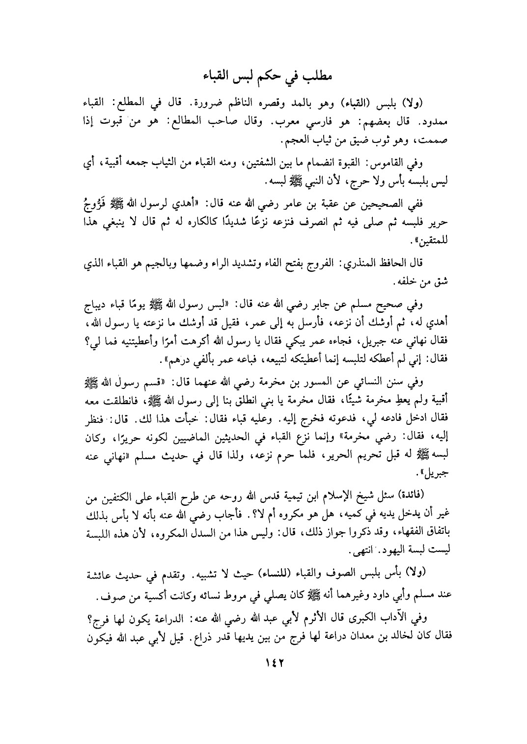 فَإِنْ قُلْت: بَيْنَ النَّهْيِ مِنْهُ - صَلَّى اللهُ عَلَيْهِ وَسَلَّمَ - وَالْفِعْلِ مُعَارَضَةٌ. قُلْتُ: لَا مُعَارَضَةَ، وَالْأَخْبَارُ صَحِيحَةٌ وَلَا عِبْرَةَ بِزَعْمِ دَعْوَى النَّسْخِ لِإِمْكَانِ الْجَمْعِ فَالنَّهْيُ مَحْمُولٌ عَلَى خِلَافِ الْأَوْلَى، وَالْكَرَاهَةُ التَّنْزِيهِيَّةُ عِنْدَ مَنْ يَرَى أَنَّ الشُّرْبَ قَائِمًا مَكْرُوهٌ. وَشُرْبُهُ - عَلَيْهِ الصَّلَاةُ وَالسَّلَامُ - قَائِمًا لِبَيَانِ الْجَوَازِ، وَمَتَى كَانَ فِعْلُهُ - عَلَيْهِ الصَّلَاةُ وَالسَّلَامُ - لِبَيَانِ الْجَوَازِ فَهُوَ تَشْرِيعٌ مُثَابٌ عَلَيْهِ لَا مَكْرُوهٌ، بَلْ الْبَيَانُ وَاجِبٌ عَلَيْهِ. وَقَوْلُهُ " قِه " مَحْمُولٌ عَلَى النَّدْبِ وَالِاسْتِحْبَابِ.