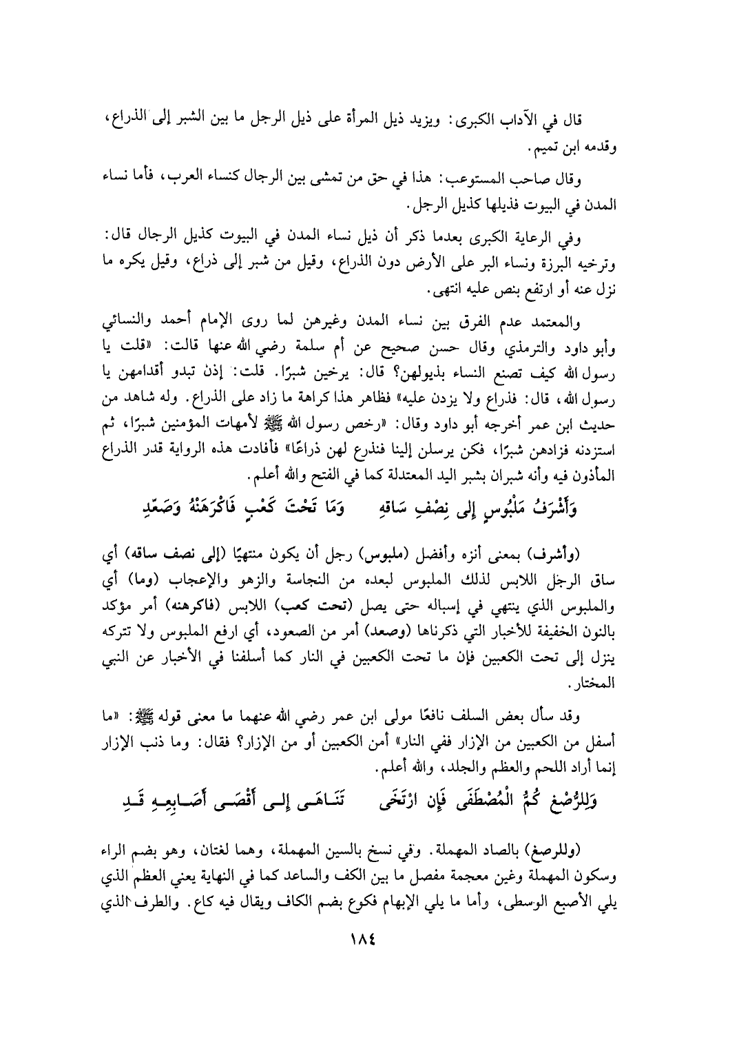 وَفِي الْآدَابِ الْكُبْرَى قَالَ الْأَثْرَمُ لِأَبِي عَبْدِ اللَّهِ - رَضِيَ اللَّهُ عَنْهُ -: الدُّرَّاعَةُ يَكُونُ لَهَا فَرْجٌ؟ فَقَالَ كَانَ لِخَالِدِ بْنِ مَعْدَانَ: دُرَّاعَةٌ لَهَا فَرْجٌ مِنْ بَيْنِ يَدَيْهَا قَدْرُ ذِرَاعٍ. قِيلَ لِأَبِي عَبْدِ اللَّهِ: فَيَكُونُ لَهَا فَرْجٌ مِنْ خَلْفِهَا؟ فَقَالَ: مَا أَدْرِي أَمَّا مِنْ بَيْنِ يَدَيْهَا فَقَدْ سَمِعْت، وَأَمَّا مِنْ خَلْفِهَا فَلَمْ أَسْمَعْ قَالَ: أَلَا إنَّ فِي ذَلِكَ سَعَةً لَهُ عِنْدَ الرُّكُوبِ، وَمَنْفَعَةً انْتَهَى.