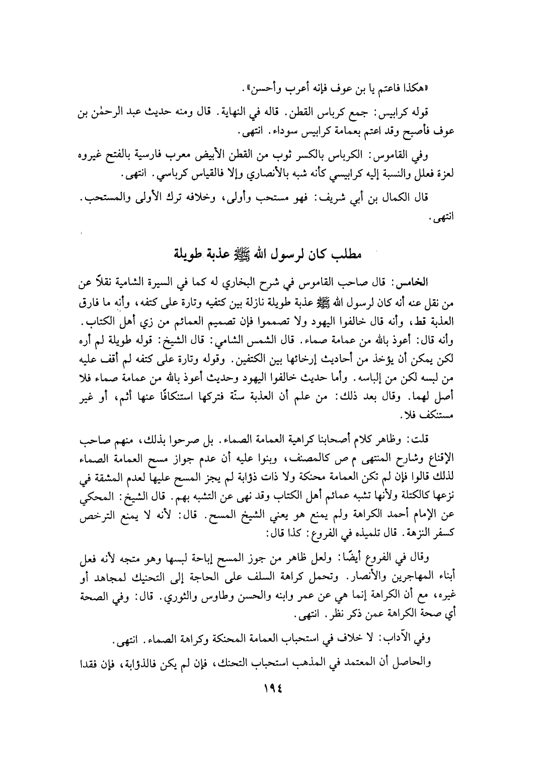 تُوُفِّيَ - رَحِمَهُ اللَّهُ تَعَالَى - وَكَتَبَ عَلَى هَذِهِ الْمَسْأَلَةِ فِي عِدَّةِ أَمَاكِنَ مِنْهَا مَا كَتَبَهُ فِي شَرْحِ الْعُمْدَةِ عَلَى قَوْلِ الْمَاتِنِ: وَيُبَاحُ مَا سُدِّيَ بِإِبْرَيْسَمٍ وَأُلْحِمَ بِغَيْرِهِ أَيْ غَيْرِ الْإِبْرَيْسَمِ مِنْ نَحْوِ صُوفٍ أَوْ قُطْنٍ. قَالَ: لَكِنْ بِشَرْطِ أَنْ يَكُونَ الْحَرِيرُ مُسْتَتِرًا وَغَيْرُ الْحَرِيرِ هُوَ الظَّاهِرَ، وَإِلَّا بِأَنْ ظَهَرَ الْحَرِيرُ وَاسْتَتَرَ غَيْرُهُ فَهُوَ كَالْمُلْحَمِ الْمُحَرَّمِ، كَمَا قَالَ فِي الِاخْتِيَارَاتِ: الْمَنْصُوصُ عَنْ أَحْمَدَ وَقُدَمَاءِ الْأَصْحَابِ إبَاحَةُ الْخَزِّ دُونَ الْمُلْحَمِ. قَالَ الْمُصَنِّفُ، يَعْنِي م ص، وَكَذَا قَالَ غَيْرُهُ مِنْ أَئِمَّةِ الْمَذْهَبِ: الْمُلْحَمُ مَا سُدِّيَ بِغَيْرِ الْحَرِيرِ وَأُلْحِمَ بِهِ انْتَهَى. فَالْمُلْحَمُ عَكْسُ الْخَزِّ صُورَةً وَحُكْمًا، وَقَدْ اشْتَبَهَ عَلَى كَثِيرٍ مِنْ النَّاسِ نَحْوُ الثِّيَابِ الْبَغْدَادِيَّةِ مِمَّا يُسَدَّى بِالْحَرِيرِ وَيُلْحَمُ بِالْقُطْنِ، لَكِنْ مَعَ ظُهُورِ الْحَرِيرِ وَاسْتِتَارِ الْقُطْنِ، فَتَوَهَّمُوا أَنَّ ذَلِكَ مِنْ الْخَزِّ الْمُبَاحِ وَغَفَلُوا عَنْ شَرْطِ الْخَزِّ، أَعْنِي اسْتِتَارَ الْحَرِيرِ وَظُهُورَ غَيْرِهِ. وَهَذَا شَرْطٌ لَا بُدَّ مِنْهُ كَمَا يَدُلُّ عَلَيْهِ مَوَاضِعُ مِنْ كَلَامِهِمْ كَمَا فِي حَوَاشِي الْفُرُوعِ لِابْنِ قُنْدُسٍ وَغَيْرِهَا. انْتَهَى. وَأَرَادَ بِقَوْلِهِ: وَقَدْ اشْتَبَهَ عَلَى كَثِيرٍ مِنْ النَّاسِ الْإِمَامَ أَبَا الْمَوَاهِبِ وَأَصْحَابَنَا الشَّامِيِّينَ، وَكَذَا كَتَبَ عَلَى هَذِهِ الْمَسْأَلَةِ فِي حَوَاشِي الْمُنْتَهَى وَلَمْ يُطِلْ الْكِتَابَةَ.، ثُمَّ إنَّهُ حَرَّرَ الْمَسْأَلَةَ فِي رِسَالَةٍ مُسْتَقِلَّةٍ وَسَأَذْكُرُهَا جُمْلَةً.