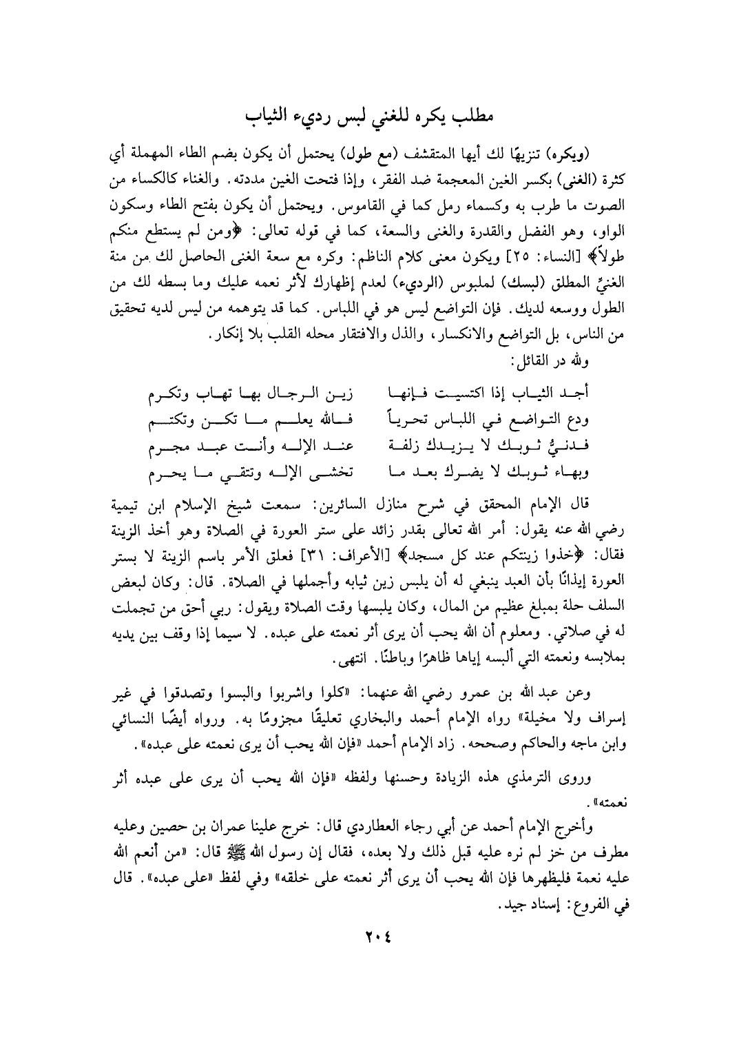 وَأَمَّا تَخْيِيطُ الْحَرِيرِ لِمَنْ يَحِلُّ لَهُ لُبْسُهُ فَلَا يَحْرُمُ (وَ) كَذَا يَحْرُمُ (النَّسْجُ) لِمَنْ يَحْرُمُ عَلَيْهِ اللُّبْسُ دُونَ غَيْرِهِ (فِي نَصِّ) الْإِمَامِ الْمُبَجَّلِ سَيِّدِنَا الْإِمَامِ أَحْمَدَ بْنِ مُحَمَّدِ بْنِ حَنْبَلٍ - رَضِيَ اللَّهُ عَنْهُ -.