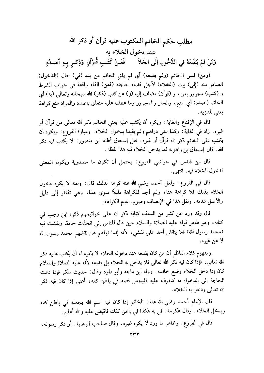 وَقَدْ رُوِيَ مَرْفُوعًا مِنْ طُرُقٍ وَاهِيَةٍ حَتَّى ذَكَرَهُ ابْنُ الْجَوْزِيِّ فِي الْمَوْضُوعَاتِ وَكُلُّ مَا يُرْوَى بِمَعْنَى ذَلِكَ فَهُوَ وَاهٍ. قَالَهُ فِي التَّمْيِيزِ. وَفِي الزُّهْدِ لِلْإِمَامِ أَحْمَدَ - رَضِيَ اللَّهُ عَنْهُ - قَالَ وَهْبُ بْنُ مُنَبِّهٍ: وَجَدْت فِي التَّوْرَاةِ أَرْبَعَةَ أَسْطُرٍ مُتَوَالِيَاتٍ إحْدَاهُنَّ مَنْ قَرَأَ كِتَابَ اللَّهِ عَزَّ وَجَلَّ فَظَنَّ أَنْ لَنْ يَغْفِرَ لَهُ فَهُوَ مِنْ الْمُسْتَهْزِئِينَ بِآيَاتِ اللَّهِ. الثَّانِيَةُ: وَمَنْ شَكَا مُصِيبَتَهُ فَإِنَّمَا شَكَا رَبَّهُ. الثَّالِثَةُ: مَنْ حَزِنَ عَلَى مَا فِي يَدِ غَيْرِهِ فَقَدْ سَخِطَ قَضَاءَ رَبِّهِ. وَالرَّابِعَةُ: مَنْ تَضَعْضَعَ لِغَنِيٍّ ذَهَبَ ثُلُثَا دِينِهِ.