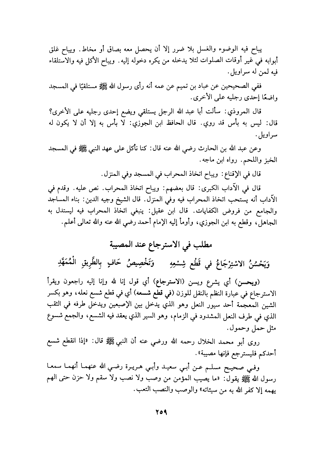 وَغَيْرُهُ: يُسْتَحَبُّ غَسْلُ الثَّوْبِ مِنْ الْوَسَخِ وَالْعَرَقِ، نَصَّ عَلَيْهِ فِي رِوَايَةِ الْمَرُّوذِيِّ وَغَيْرِهِ، وَاحْتَجَّ بِأَنَّ النَّبِيَّ - صَلَّى اللهُ عَلَيْهِ وَسَلَّمَ - قَالَ: «مَا يَجِدُ هَذَا مَا يَغْسِلُ بِهِ ثَوْبَهُ» «وَرَأَى رَجُلًا شُعْثًا فَقَالَ: مَا كَانَ يَجِدُ هَذَا مَا يُسْكِنُ بِهِ رَأْسَهُ» رَوَاهُ الْإِمَامُ أَحْمَدُ وَالْخَلَّالُ مِنْ حَدِيثِ جَابِرٍ - رَضِيَ اللَّهُ عَنْهُ -. وَعَلَّلَهُ الْإِمَامُ أَحْمَدُ - رَضِيَ اللَّهُ عَنْهُ - بِأَنَّ الثَّوْبَ إذَا اتَّسَخَ تَقَطَّعَ.