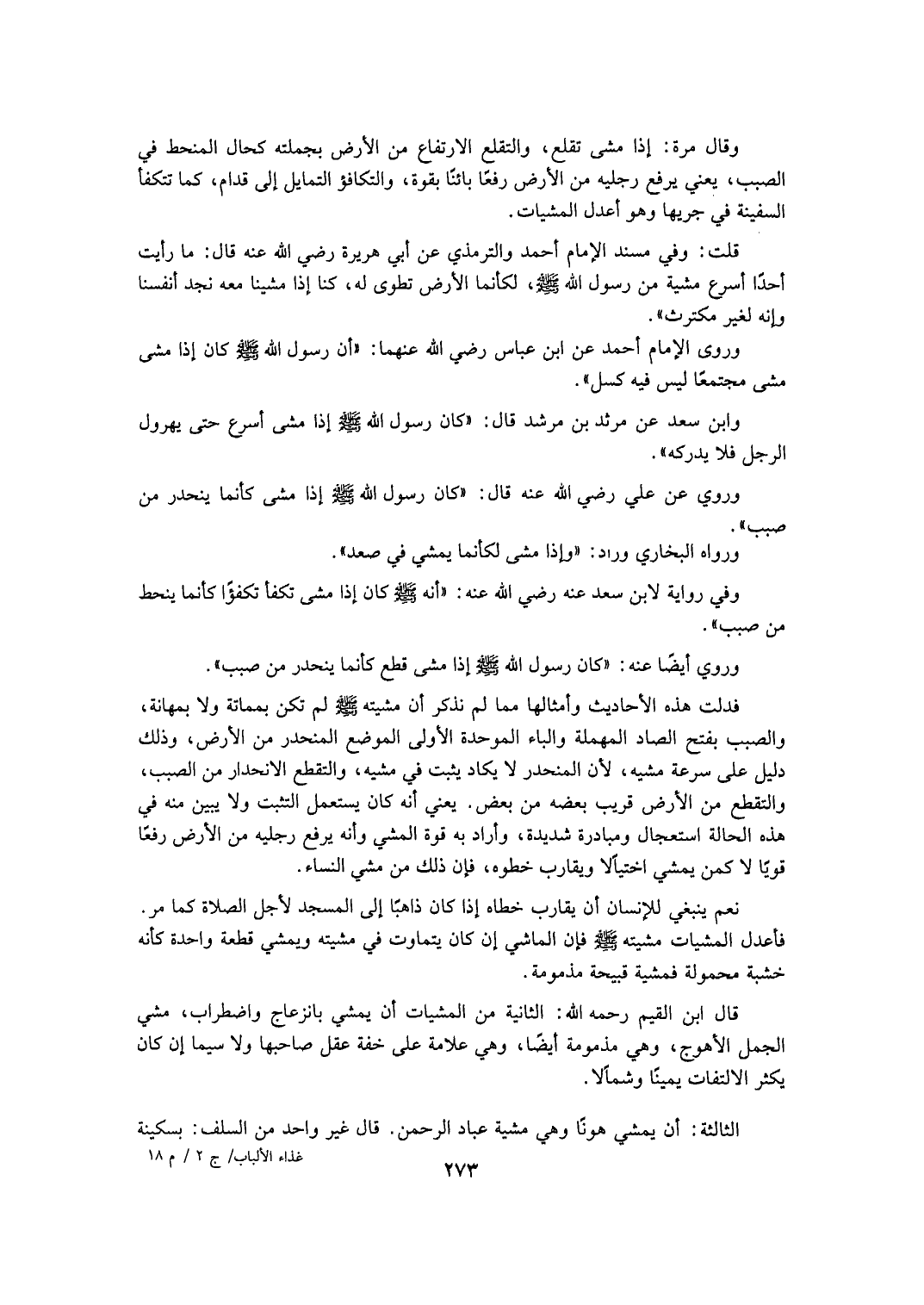 وَفِي مُسْلِمٍ عَنْ أَبِي عُثْمَانَ النَّهْدِيِّ قَالَ: كَتَبَ إلَيْنَا عُمَرُ - رَضِيَ اللَّهُ عَنْهُ - يَا عُتْبَةَ بْنَ فَرْقَدٍ إنَّهُ لَيْسَ مِنْ كَدِّك وَلَا مِنْ كَدِّ أَبِيك وَلَا كَدِّ أُمِّك فَأَشْبِعْ الْمُسْلِمِينَ فِي رِحَالِهِمْ مِمَّا تَشْبَعُ مِنْهُ فِي رَحْلِك، وَإِيَّاكَ وَالتَّنَعُّمَ وَزِيَّ أَهْلِ الشِّرْكِ، وَلُبُوسَ الْحَرِيرِ وَهُوَ فِي مُسْنَدِ أَبِي عَوَانَةَ الْإسْفَرايِينِيّ وَغَيْرِهِ بِإِسْنَادٍ صَحِيحٍ كَمَا فِي الْفُرُوعِ: أَمَّا بَعْدُ فَاتَّزِرُوا وَارْتَدُوا، وَأَلْقُوا الْخِفَافَ وَالسَّرَاوِيلَاتِ، وَعَلَيْكُمْ بِلِبَاسِ أَبِيكُمْ إسْمَاعِيلَ، وَإِيَّاكُمْ وَالتَّنَعُّمَ وَزِيَّ الْأَعَاجِمِ وَعَلَيْكُمْ بِالشَّمْسِ فَإِنَّهَا حَمَّامُ الْعَرَبِ، وَتَمَعْدَدُوا، وَاخْشَوْشِنُوا، وَاخْلَوْلِقُوا، وَاقْطَعُوا الرَّكَبَ وَانْزُوا وَارْمُوا الْأَغْرَاضَ.