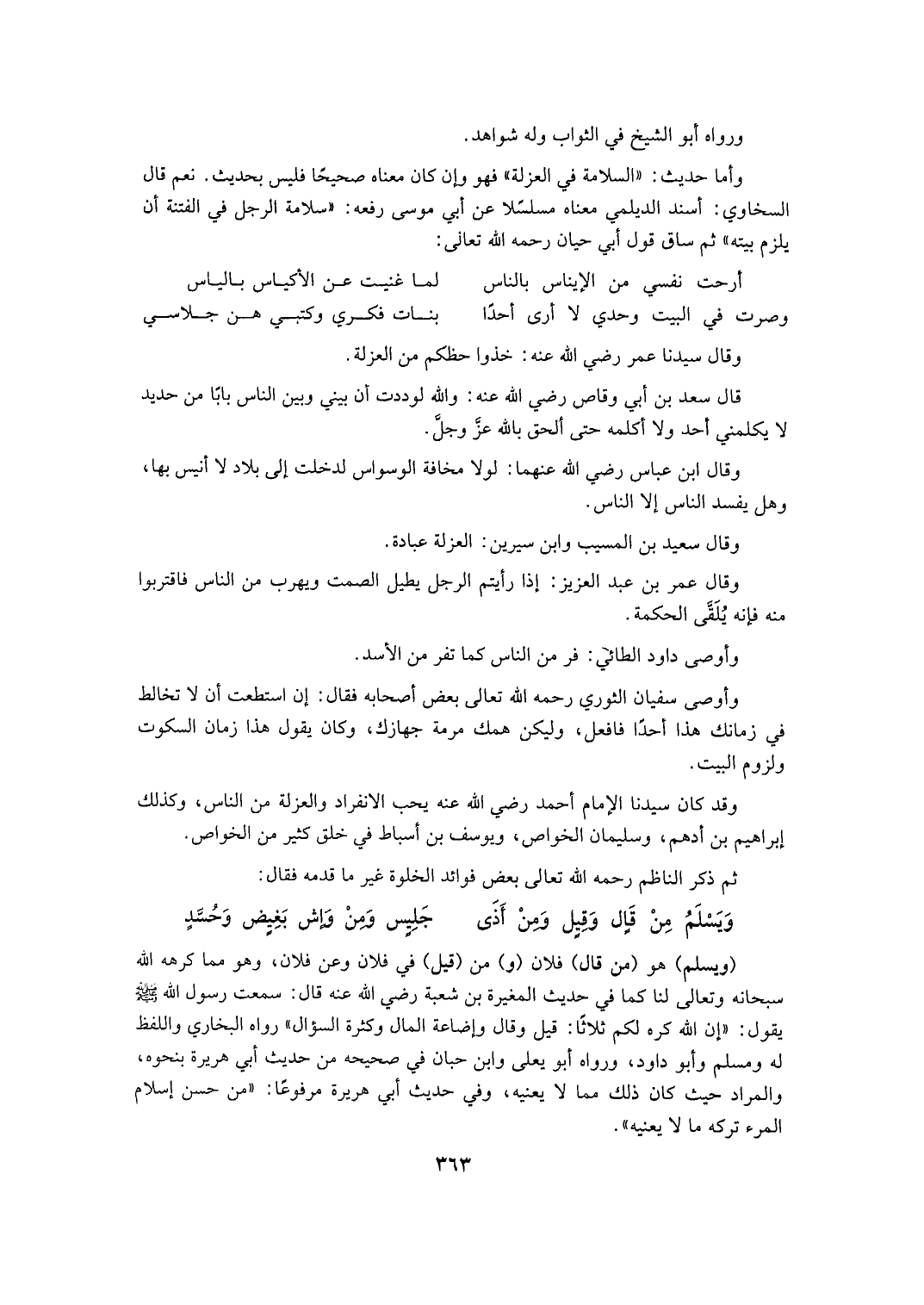 وَرُوِيَ أَيْضًا عَنْ ابْنِ عَبَّاسٍ - رَضِيَ اللَّهُ عَنْهُمَا - مَرْفُوعًا «إنَّ لِكُلِّ شَيْءٍ شَرَفًا، وَإِنَّ أَشْرَفَ الْمَجَالِسِ مَا اُسْتُقْبِلَ بِهِ الْقِبْلَةُ» . وَرَوَى أَبُو بَكْرِ بْنُ أَبِي شَيْبَةَ وَغَيْرُهُ عَنْ قَيْسِ بْنِ أَبِي حَازِمٍ قَالَ: «رَأَى رَسُولُ اللَّهِ - صَلَّى اللهُ عَلَيْهِ وَسَلَّمَ - أَبِي فِي الشَّمْسِ فَأَمَرَهُ أَنْ يَتَحَوَّلَ إلَى الظِّلِّ» وَرَوَاهُ أَبُو دَاوُد عَنْ قَيْسٍ عَنْ أَبِيهِ أَنَّهُ «جَاءَ وَرَسُولُ اللَّهِ - صَلَّى اللهُ عَلَيْهِ وَسَلَّمَ - يَخْطُبُ فَقَامَ فِي الشَّمْسِ فَأَمَرَ بِهِ فَحُوِّلَ إلَى الظِّلِّ» إسْنَادُهُ جَيِّدٌ، وَرَوَاهُ الْإِمَامُ أَحْمَدُ عَنْ وَكِيعٍ عَنْ إسْمَاعِيلَ بْنِ أَبِي خَالِدٍ عَنْ قَيْسِ بْنِ أَبِي حَازِمٍ عَنْ أَبِيهِ.
