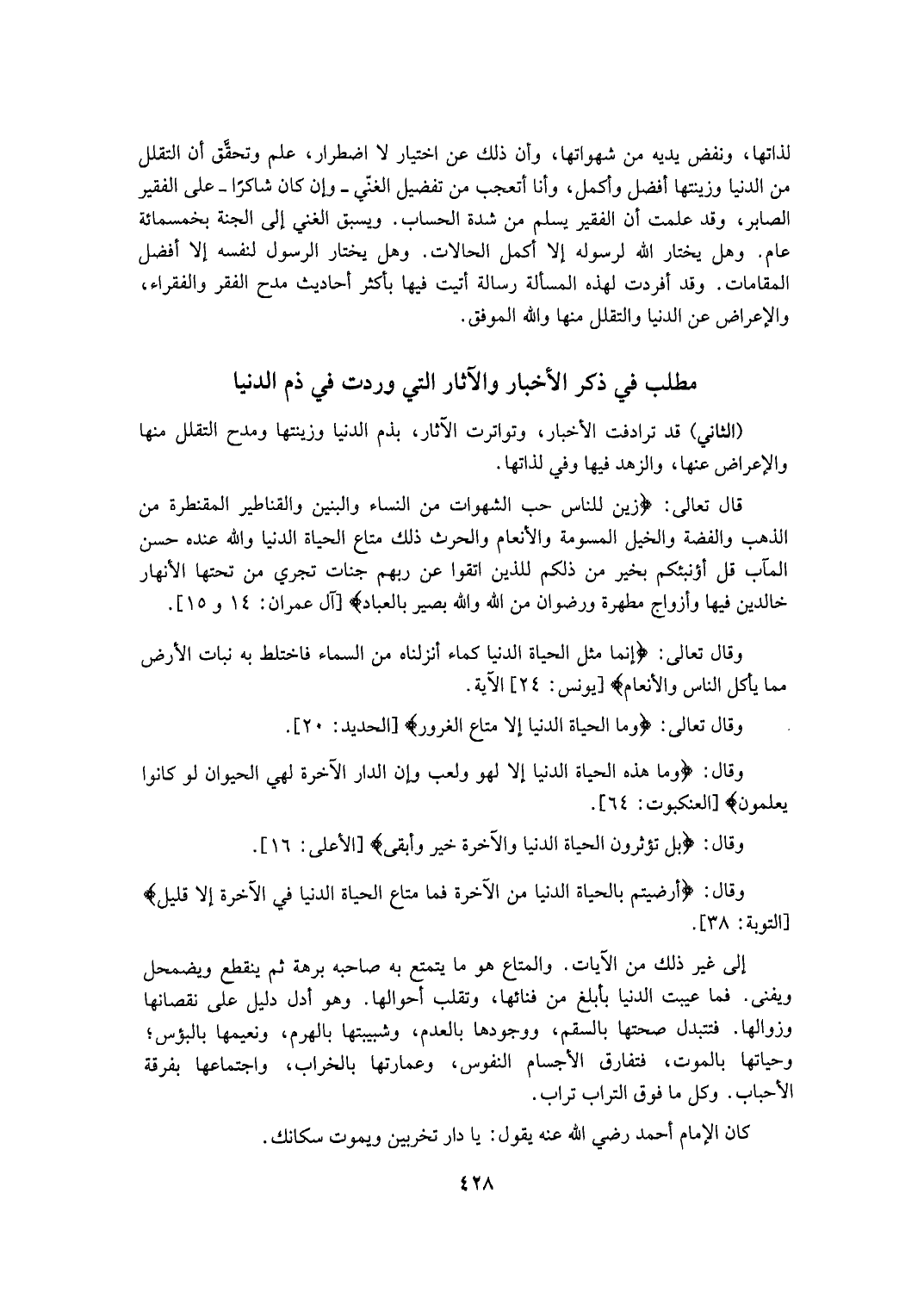 قَالَ وَسَمِعْت شَيْخَ الْإِسْلَامِ ابْنَ تَيْمِيَّةَ - قَدَّسَ اللَّهُ رُوحَهُ - يَقُولُ: «إنَّ اللَّهَ تَعَالَى أَوْحَى إلَى إبْرَاهِيمَ أَتَدْرِي لَمْ اتَّخَذْتُك خَلِيلًا؟ قَالَ لَا، قَالَ: لِأَنِّي رَأَيْت الْعَطَاءَ أَحَبُّ إلَيْك مِنْ الْأَخْذِ» . قَالَ وَهَذِهِ صِفَةٌ مِنْ صِفَاتِ الرَّبِّ جَلَّ جَلَالُهُ، فَإِنَّهُ يُعْطِي وَلَا يَأْخُذُ، وَيُطْعِمُ وَلَا يُطْعَمُ، وَهُوَ أَجْوَدُ الْأَجْوَدِينَ، وَأَكْرَمُ الْأَكْرَمِينَ، وَأَحَبُّ الْخَلْقِ إلَيْهِ مَنْ اتَّصَفَ بِصِفَاتِهِ، فَإِنَّهُ كَرِيمٌ يُحِبُّ الْكَرِيمَ مِنْ عِبَادِهِ، وَعَالِمٌ يُحِبُّ الْعُلَمَاءَ، وَقَادِرٌ يُحِبُّ الشُّجْعَانَ، وَجَمِيلٌ يُحِبُّ الْجَمَالَ، انْتَهَى. .