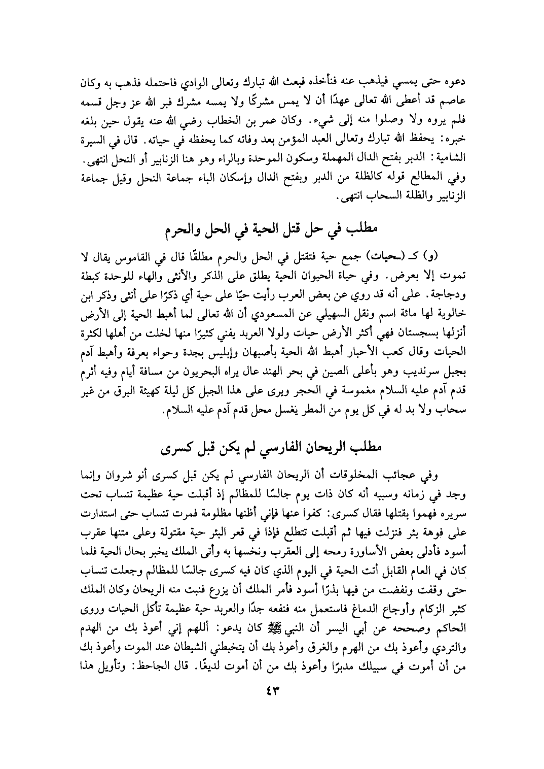 قَالَ فِي حَيَاةِ الْحَيَوَانِ: فَلَمَّا اُبْتُلِيَ دَانْيَالُ - عَلَيْهِ السَّلَامُ - أَوَّلًا وَآخِرًا بِالسِّبَاعِ جَعَلَ اللَّهُ الِاسْتِعَاذَةَ بِهِ فِي ذَلِكَ تَمْنَعُ شَرَّهَا الَّذِي لَا يُسْتَطَاعُ وَمِثْلُ الْأَسَدِ فِي حَالِ قَتْلِهِ فِي الْحِلِّ، وَالْحَرَمِ الْكَلْبُ الْعَقُورُ، وَالْأَسْوَدُ الْبَهِيمُ.