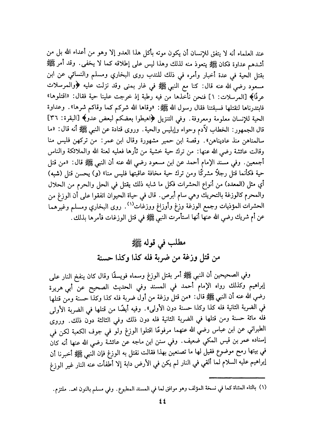 وَرَوَى مُسْلِمٌ مِنْ حَدِيثِ ابْنِ عُمَرَ مَرْفُوعًا «لَا جُنَاحَ عَلَى مَنْ قَتَلَهُنَّ فِي الْحَرَمِ» ، وَالْإِحْرَامِ، وَعَبَّرَ بِالِاسْتِحْبَابِ جَمَاعَةٌ مِمَّنْ تَكَلَّمَ عَلَى الْأَحَادِيثِ.
