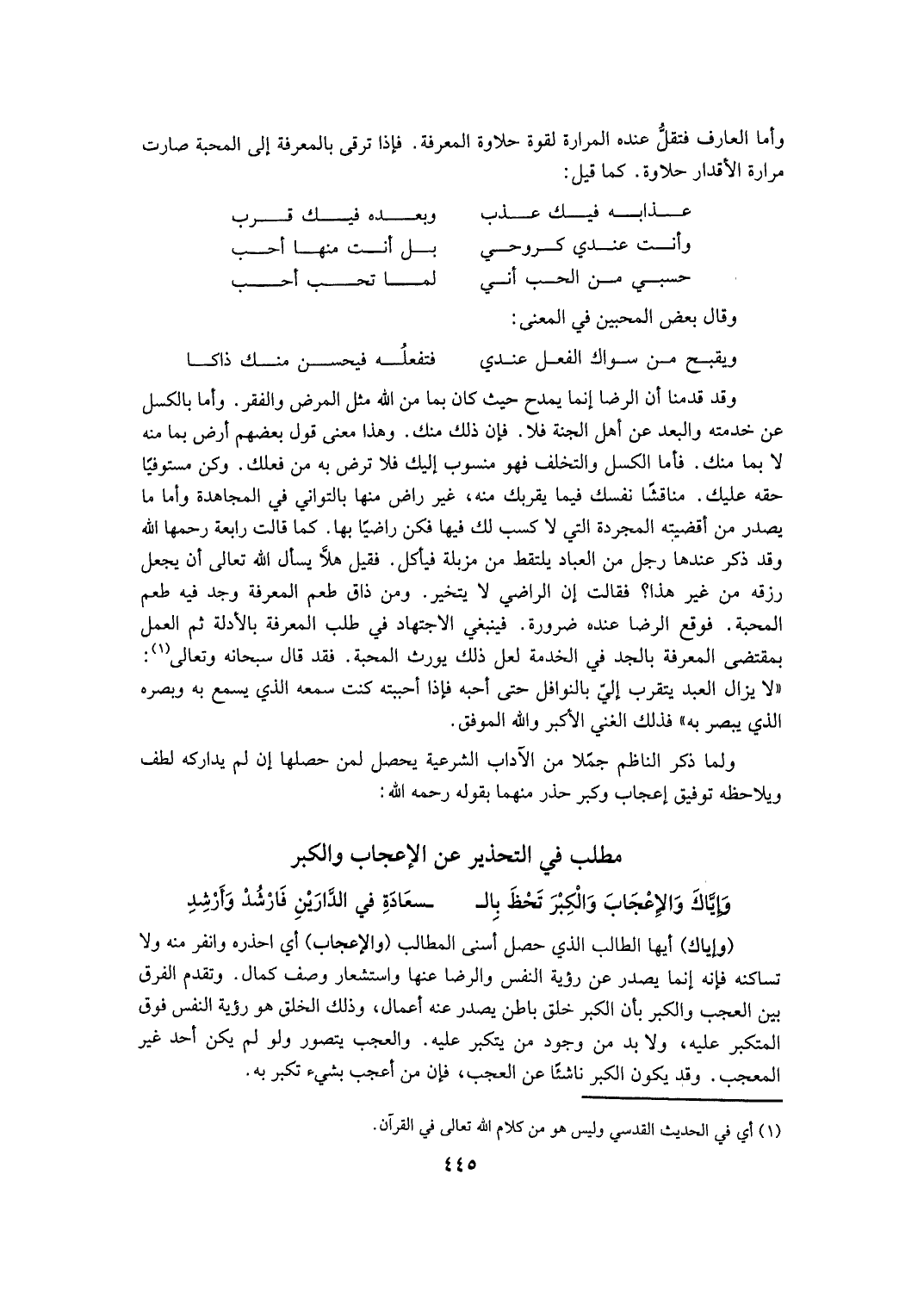 وَفِي الْقُرْآنِ الْعَظِيمِ {انْظُرُونَا نَقْتَبِسْ مِنْ نُورِكُمْ} [الحديد: 13] فَمُرَادُ النَّاظِمِ أَنْ تَكُونَ أَيُّهَا الْأَخُ الْبَاذِلُ جُهْدَهُ فِي طَلَبِ الْعِلْمِ وَاسْتِفَادَتِهِ (طَلَّاعُ) أَيْ قَصَّادُ (أَنْجُدِ) قَالَ فِي الْقَامُوسِ: وَرَجُلٌ طَلَّاعُ الثَّنَايَا وَالْأَنْجُدِ كَشَدَّادٍ مُجَرِّبٍ لِلْأُمُورِ رَكَّابٌ لَهَا يَعْلُوهَا وَيَقْهَرُهَا بِمَعْرِفَتِهِ وَتَجَارِبِهِ وَجَوْدَةِ رَأْيِهِ أَوْ الَّذِي يَؤُمُّ مَعَالِيَ الْأُمُورِ، انْتَهَى. وَالْأَنْجُدُ جَمْعُ نَجْدٍ وَهُوَ مَا أَشْرَفَ مِنْ الْأَرْضِ وَالطَّرِيقِ الْوَاضِحِ الْمُرْتَفِعِ وَمَا خَالَفَ الْغَوْرَ أَيْ تِهَامَةَ، وَتُضَمُّ جِيمُهُ مُذَكَّرٌ، أَعْلَاهُ تِهَامَةُ وَالْيَمَنُ، وَأَسْفَلُهُ الْعِرَاقُ وَالشَّامُ، وَأَوَّلُهُ مِنْ جِهَةِ الْحِجَازِ ذَاتُ عِرْقٍ. قَالَهُ فِي الْقَامُوسِ.