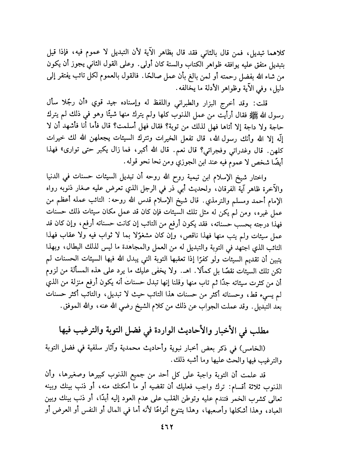وَقَدْ جَاءَ فِي مَدْحِ الْعُزْلَةِ عِدَّةُ أَخْبَارٍ، عَنْ النَّبِيِّ الْمُخْتَارِ، وَجُمْلَةُ آثَارٍ، عَنْ السَّلَفِ الْأَخْيَارِ، فَقَدْ رَوَى الْبُخَارِيُّ وَمُسْلِمٌ وَغَيْرُهُمَا عَنْ أَبِي سَعِيدٍ الْخُدْرِيِّ - رَضِيَ اللَّهُ عَنْهُ - قَالَ: «قَالَ رَجُلٌ أَيُّ النَّاسِ أَفْضَلُ يَا رَسُولَ اللَّهِ؟ قَالَ مُؤْمِنٌ يُجَاهِدُ بِنَفْسِهِ وَمَالِهِ فِي سَبِيلِ اللَّهِ. قَالَ ثُمَّ مَنْ؟ قَالَ: رَجُلٌ مُعْتَزِلٌ فِي شِعْبٍ مِنْ الشِّعَابِ يَعْبُدُ رَبَّهُ» - وَفِي رِوَايَةٍ لَهُمَا «- يَتَّقِي اللَّهَ وَيَدَعُ النَّاسَ مِنْ شَرِّهِ» . وَرَوَاهُ الْحَاكِمُ بِإِسْنَادٍ عَلَى شَرْطِهِمَا بِلَفْظِ «أَيُّ الْمُؤْمِنِينَ أَكْمَلُ إيمَانًا؟ قَالَ: مُؤْمِنٌ يُجَاهِدُ بِنَفْسِهِ وَمَالِهِ، وَرَجُلٌ يَعْبُدُ رَبَّهُ فِي شِعْبٍ مِنْ الشِّعَابِ وَقَدْ كَفَى النَّاسَ شَرَّهُ» .