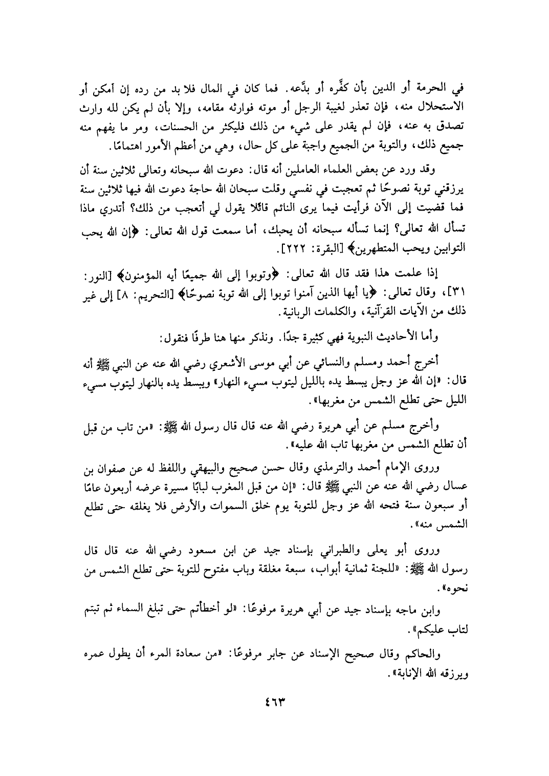 وَرَوَى أَيْضًا فِي الْأَوْسَطِ وَالصَّغِيرِ وَحَسَّنَ إسْنَادَهُ عَنْ ثَوْبَانَ قَالَ: - رَضِيَ اللَّهُ عَنْهُ - قَالَ رَسُولُ اللَّهِ - صَلَّى اللهُ عَلَيْهِ وَسَلَّمَ - «طُوبَى لِمَنْ مَلَكَ لِسَانَهُ، وَوَسِعَهُ بَيْتُهُ، وَبَكَى عَلَى خَطِيئَتِهِ» . وَالتِّرْمِذِيُّ وَحَسَّنَهُ وَابْنُ أَبِي الدُّنْيَا وَالْبَيْهَقِيُّ عَنْ عُقْبَةَ بْنِ عَامِرٍ - رَضِيَ اللَّهُ عَنْهُ - قَالَ «قُلْتُ يَا رَسُولَ اللَّهِ مَا النَّجَاةُ؟ قَالَ أَمْسِكْ عَلَيْكَ لِسَانَكَ، وَلْيَسَعْكَ بَيْتُكَ، وَابْكِ عَلَى خَطِيئَتِكَ» .