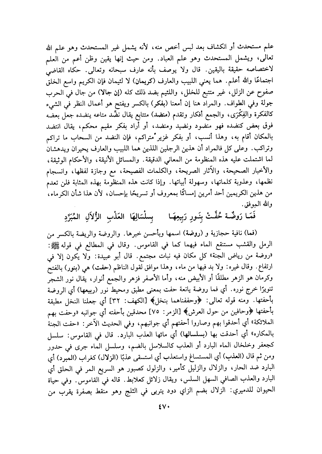 وَقَوْلُ النَّاظِمِ مُؤَيَّدُ. النُّسَخُ الَّتِي رَأَيْتهَا بِالْبَاءِ الْمُوَحَّدَةِ أَيْ الدَّائِمِ الْمُسْتَمِرِّ، وَالصَّوَابُ أَنَّهُ بِالْيَاءِ الْمُثَنَّاةِ تَحْتُ مِنْ أَيَّدْتُهُ تَأْيِيدًا قَوَّيْته تَقْوِيَةً.