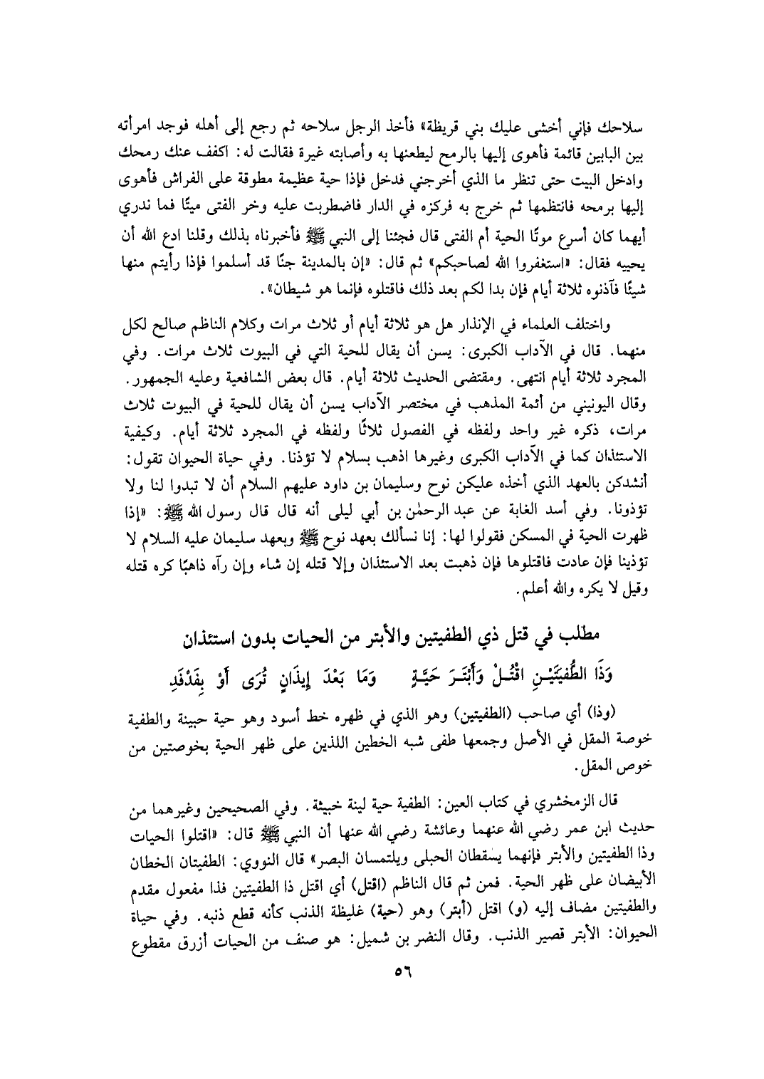 وَقَدْ أَمَرَ - صَلَّى اللهُ عَلَيْهِ وَسَلَّمَ - بِقَتْلِ الْحَيَّةِ فِي عِدَّةِ أَخْبَارٍ، وَأَمْرُهُ فِي ذَلِكَ لِلنَّدَبِ رَوَى الْبُخَارِيُّ وَمُسْلِمٌ وَالنَّسَائِيِّ عَنْ ابْنِ مَسْعُودٍ - رَضِيَ اللَّهُ عَنْهُ - قَالَ: «كُنَّا مَعَ النَّبِيِّ - صَلَّى اللهُ عَلَيْهِ وَسَلَّمَ - فِي غَارٍ بِمِنًى، وَقَدْ نَزَلَتْ عَلَيْهِ {وَالْمُرْسَلاتِ عُرْفًا} [المرسلات: 1] فَنَحْنُ نَأْخُذُهَا مِنْ فِيهِ رَطْبَةً إذْ خَرَجَتْ عَلَيْنَا حَيَّةٌ فَقَالَ: اُقْتُلُوهَا فَابْتَدَرْنَاهَا لِنَقْتُلَهَا فَسَبَقَتْنَا فَقَالَ رَسُولُ اللَّهِ - صَلَّى اللهُ عَلَيْهِ وَسَلَّمَ -: وَقَاهَا اللَّهُ شَرَّكُمْ كَمَا وَقَاكُمْ شَرَّهَا» .