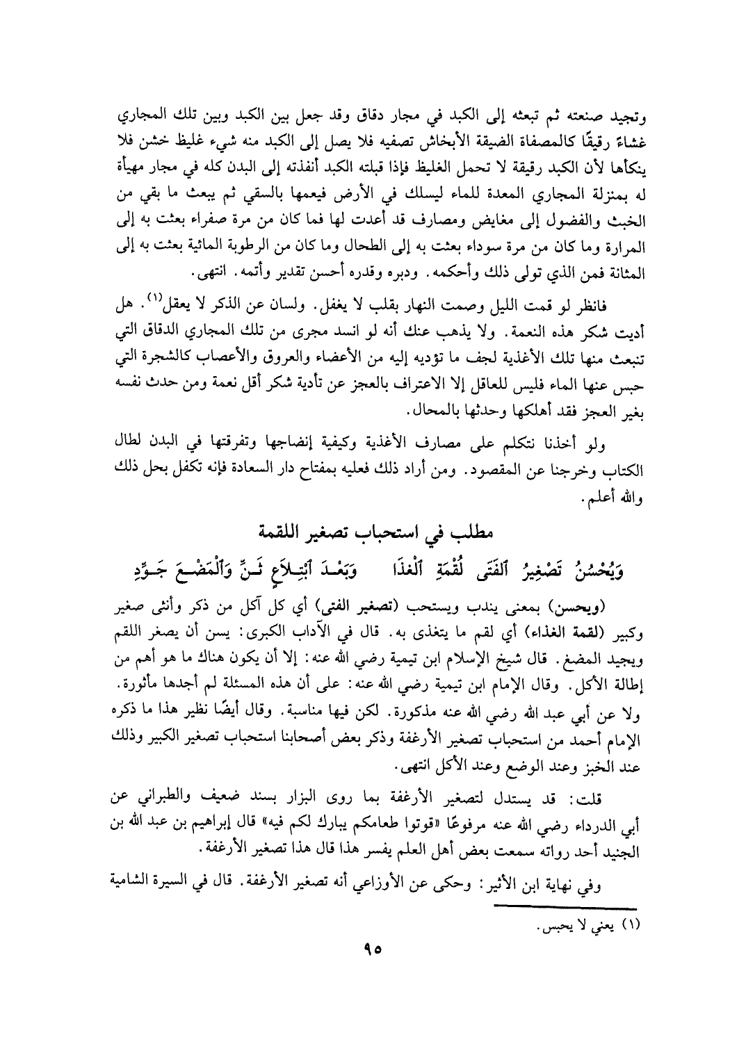 قَالَ فِي الْآدَابِ الْكُبْرَى: وَكَذَا حَكَاهُ ابْنُ الْبَنَّا عَنْ الشَّافِعِيِّ انْتَهَى. قَالَ ابْنُ مُفْلِحٍ فِي الْآدَابِ: وَلِأَنَّ الْأَكْلَ بِأُصْبُعَيْنِ يَطُولُ حَتَّى يَشْبَعَ وَلَا تَفْرَحُ الْمَعِدَةُ، وَالْأَعْضَاءُ بِذَلِكَ لِقِلَّتِهِ كَمَنْ يَأْخُذُ حَقَّهُ قَلِيلًا قَلِيلًا لَا يَسْتَلِذُّ بِهِ وَلَا يُمْرِئُهُ، وَبِأَرْبَعِ أَصَابِعَ قَدْ يَغَصُّ بِهِ لِكَثْرَتِهِ، وَالْمُرَادُ أَلَّا يَتَنَاوَلَ عَادَةً وَعُرْفًا بِأُصْبُعٍ، أَوْ أُصْبُعَيْنِ، فَإِنَّ الْعُرْفَ يَقْتَضِيهِ.