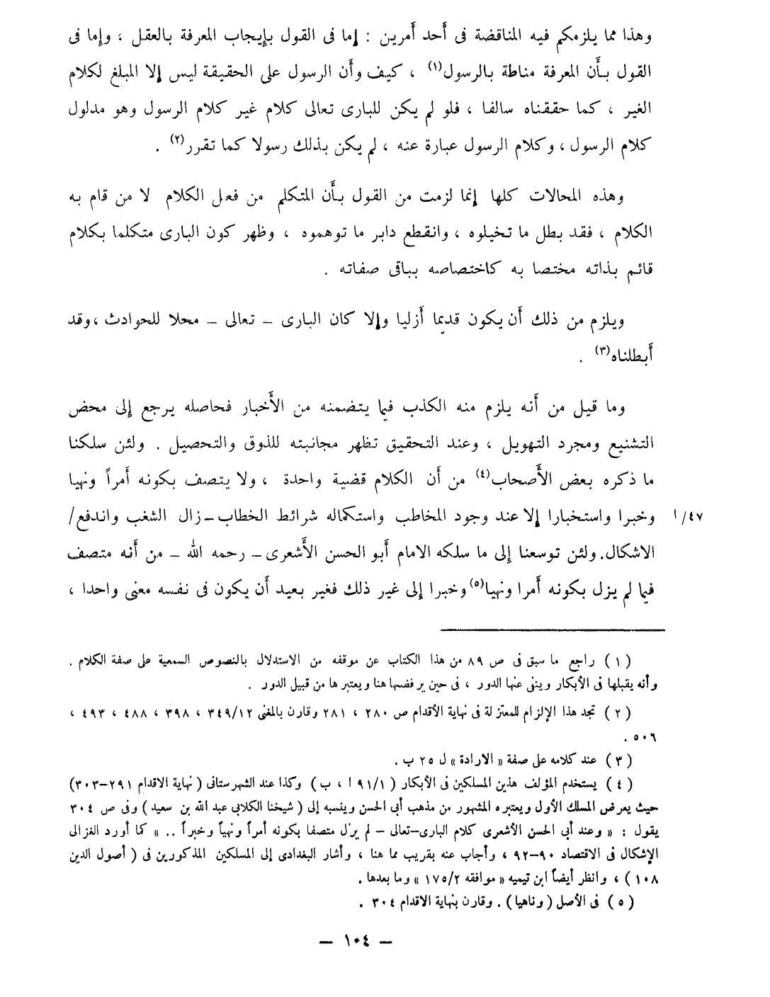 وَهَذَا مِمَّا يلزمكم فِيهِ المناقضة فِي أحد أَمريْن إِمَّا فِي القَوْل بِإِيجَاب الْمعرفَة بِالْعقلِ وَإِمَّا فِي القَوْل بِأَن الْمعرفَة مناطة بالرسول كَيفَ وَأَن الرَّسُول على الْحَقِيقَة لَيْسَ إِلَّا الْمبلغ لكَلَام الْغَيْر كَمَا حققناه سالفا فَلَو لم يكن للبارى تَعَالَى كَلَام غير كَلَام الرَّسُول هُوَ مَدْلُول كَلَام الرَّسُول وَكَلَام الرَّسُول عبارَة عَنهُ لم يكن بذلك رَسُولا كَمَا تقرر