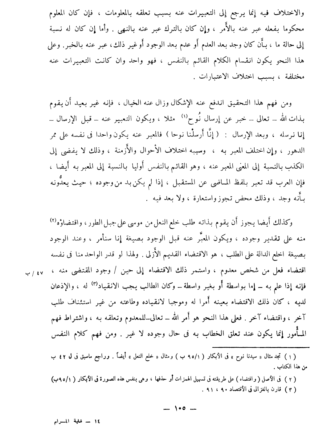 وَكَذَلِكَ أَيْضا يجوز أَن يقوم بِذَاتِهِ طلب خلع النَّعْل من مُوسَى على جبل الطّور واقتضاؤه مِنْهُ على تَقْدِير وجوده وَيكون الْمعبر عَنهُ قبل الْوُجُود بِصِيغَة إِنَّا سنأمر وَعند الْوُجُود بِصِيغَة اخلع الدَّالَّة على الطّلب هُوَ الِاقْتِضَاء الْقَدِيم الأزلى وَلِهَذَا لَو قدر الْوَاحِد منا فِي نَفسه اقْتِضَاء فعل من شخص مَعْدُوم وَاسْتمرّ ذَلِك الِاقْتِضَاء إِلَى حِين وجود الْمُقْتَضى مِنْهُ فَإِنَّهُ إِذا علم بِهِ إِمَّا بِوَاسِطَة أَو بِغَيْر وَاسِطَة وَكَانَ الطَّالِب يجب الانقياد لَهُ والإذغان لَدَيْهِ كَانَ ذَلِك الِاقْتِضَاء بِعَيْنِه امرا لَهُ وموجبا لانقياده وطاعته من غير اسْتِئْنَاف طلب آخر واقتضاء آخر فعلى هَذَا النَّحْو هُوَ أَمر الله تَعَالَى للمعدوم وتعلقه بِهِ وَاشْتِرَاط فهم الْمَأْمُور إِنَّمَا يكون عِنْد تعلق الْخطاب بِهِ فِي حَال وجوده لَا غير وَمن فهم كَلَام النَّفس