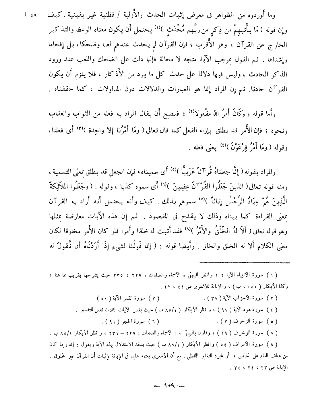 وَمَا أوردوه من الظَّوَاهِر فِي معرض إِثْبَات الْحَدث والأولية فظنية غير يقينية كَيفَ وَإِن قَوْله {مَا يَأْتِيهم من ذكر من رَبهم مُحدث} يحْتَمل أَن يكون مَعْنَاهُ الْوَعْظ والتذكير الْخَارِج عَن الْقُرْآن وَهُوَ الْأَقْرَب فَإِن الْقُرْآن لم يحدث عِنْدهم لعبا وضحكا بل إفحاما وإشداها ثمَّ القَوْل بِمُوجب الْآيَة مُتَّجه لَا محَالة فَإِنَّهَا دلّت على الضحك واللعب عِنْد وُرُود الذّكر الْحَادِث وَلَيْسَ فِيهَا دلَالَة على حدث كل مَا يرد من الْأَذْكَار فَلَا يلْزم أَن يكون الْقُرْآن حَادِثا ثمَّ إِن المُرَاد إِنَّمَا هُوَ الْعبارَات والدلالات دون المدلولات كَمَا حققناه