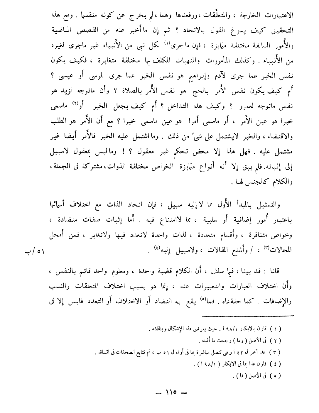 الاعتبارات الْخَارِجَة والمتعلقات ورفعناها وهما لم يخرج عَن كَونه منقسما وَمَعَ هَذَا التَّحْقِيق كَيفَ يسوغ القَوْل بالاتحاد ثمَّ ان مَا اخبر عَنهُ من الْقَصَص الْمَاضِيَة والأمور السالفة مُخْتَلفَة متمايزة فَإِن مَا جرى لكل نبى من الانبياء غير مَا جرى لغيره من الانبياء وَكَذَلِكَ المأمورات والمنهيات الْمُكَلف بهَا مُخْتَلفَة مُتَغَايِرَة فَكيف يكون نفس الْخَبَر عَمَّا جرى لآدَم وَإِبْرَاهِيم هُوَ نفس الْخَبَر عَمَّا جرى لمُوسَى اَوْ عِيسَى أم كَيفَ يكون نفس الامر بِالْحَجِّ هُوَ نفس الْأَمر بِالصَّلَاةِ وَأَن مَا توجه لزيد هُوَ نفس مَا توجه لعَمْرو وَكَيف هَذَا التَّدَاخُل أم كَيفَ يَجْعَل الْخَبَر أَو مَا سمى خَبرا هُوَ عين الْأَمر أَو مَا سمى أمرا هُوَ عين مَا سمى خَبرا مَعَ أَن الْأَمر هُوَ الطّلب والاقتضاء وَالْخَبَر لَا يشْتَمل على شئ من ذَلِك وَمَا اشْتَمَل عَلَيْهِ الْخَبَر فَالْأَمْر أَيْضا غير مُشْتَمل عَلَيْهِ فَهَل هَذَا إِلَّا مَحْض تحكم غير مَعْقُول وَمَا لَيْسَ بمعقول لَا سَبِيل إِلَى إثْبَاته فَلم يبْق إِلَّا أَنه أَنْوَاع متمايزة الْخَواص مُخْتَلفَة الذوات مُشْتَركَة فِي الْجُمْلَة وَالْكَلَام كالجنس لَهَا