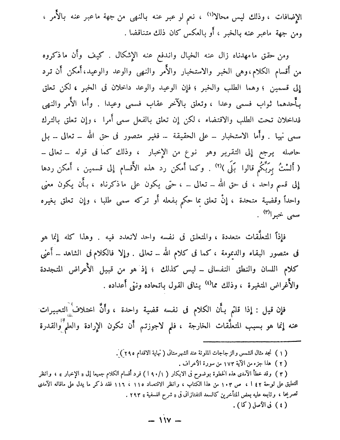 فَإِذا المتعلقات مُتعَدِّدَة والمتعلق فِي نَفسه وَاحِدًا لَا تعدد فِيهِ وَهَذَا كُله إِنَّمَا هُوَ فِي مُتَصَوّر الْبَقَاء والديمومة كَمَا فِي كَلَام الله تعإلى وَإِلَّا فَالْكَلَام فِي الشَّاهِد إعنى كَلَام اللِّسَان والنطق النفسانى لَيْسَ كَذَلِك إِذْ هُوَ من قبيل الْأَعْرَاض المتجددة والأغراض المتغيرة وَذَلِكَ مِمَّا ينافى القَوْل باتحاده وَنفى أعداده