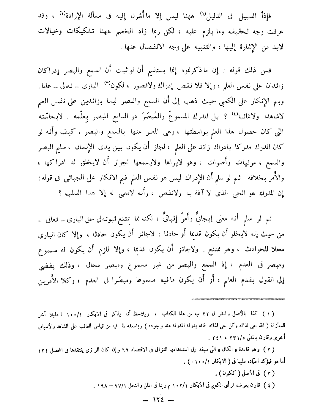 فَمن ذَلِك قَوْله إِن مَا ذكرتموه إِنَّمَا يَسْتَقِيم أَن لَو ثَبت أَن السّمع وَالْبَصَر إدراكان زائدان على نفس الْعلم وَإِلَّا فَلَا نقص إِدْرَاك وَلَا قُصُور لكَون البارى تَعَالَى عَالما