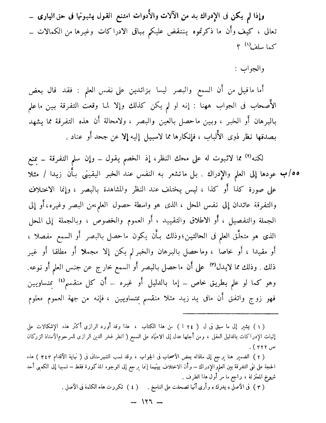 وَالْجَوَاب أما مَا قيل من أَن السّمع وَالْبَصَر ليسَا بزائدين على نفس الْعلم فقد قَالَ بعض الْأَصْحَاب فِي الْجَواب هَهُنَا إِنَّه لَو لم يكن كَذَلِك وَإِلَّا لما وَقعت التَّفْرِقَة بَين مَا علم بالبرهان أَو الْخَبَر وَبَين مَا حصل بِالْعينِ وَالْبَصَر وَلَا محَالة أَن هَذِه التَّفْرِقَة مِمَّا يشْهد بصفدقها نظر ذوى الْأَلْبَاب فإنكارها مِمَّا لَا سَبِيل إِلَيْهِ إِلَّا عَن جحد أَو عناد
