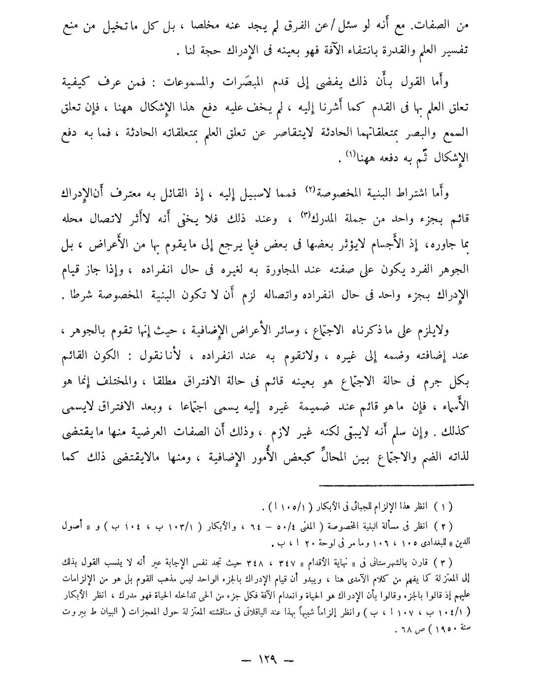 وَأما إشتراط البنية الْمَخْصُوصَة فمما لَا سَبِيل إِلَيْهِ إِذْ الْقَائِل بِهِ معترف أَن الْإِدْرَاك قَائِم بِجُزْء وَاحِد من جملَة الْمدْرك وَعند ذَلِك فَلَا يخفى أَنه لَا أثر لاتصال مَحَله بِمَا جاوره إِذْ الاجسام لَا يُؤثر بَعْضهَا فِي بعض فِيمَا يرجع إِلَى مَا يقوم بهَا من الْأَعْرَاض بل الْجَوْهَر الْفَرد يكون على صفته عِنْد الْمُجَاورَة بِهِ لغيره فِي حَال انْفِرَاده وَإِذا جَازَ قيام الْإِدْرَاك بِجُزْء وَاحِد فِي حَال انْفِرَاده واتصاله لزم أَن لَا تكون البنية الْمَخْصُوصَة شرطا