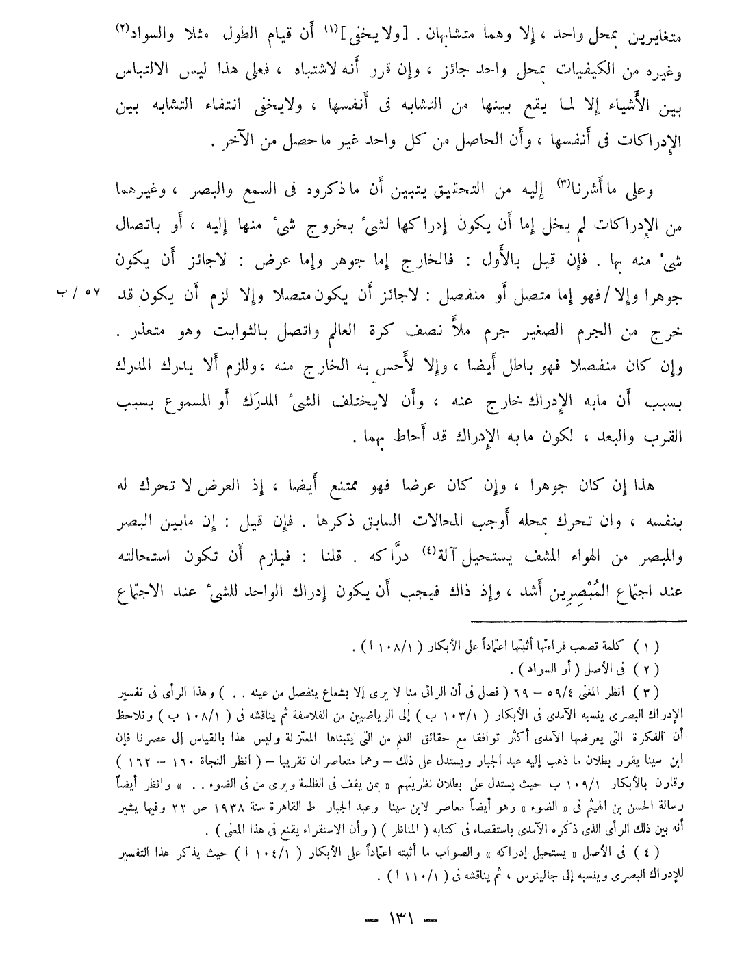 وعَلى مَا أَشَرنَا إِلَيْهِ من التَّحْقِيق يتَبَيَّن أَن مَا ذَكرُوهُ فِي السّمع وَالْبَصَر وَغَيرهمَا من الإدراكات لم يخل إِمَّا أَن يكون إِدْرَاكهَا لشئ بِخُرُوج شئ مِنْهَا إِلَيْهِ أَو بإتصال شئ مِنْهُ بهَا فَإِن قيل بِالْأولِ فالخارج اما جَوْهَر وَإِمَّا عرض لَا جَائِز أَن يكون جوهرا وَإِلَّا فَهُوَ إِمَّا مُتَّصِل أَو مُنْفَصِل لَا جَائِز أَن يكون مُتَّصِلا وَإِلَّا لزم أَن يكون قد خرج من الجرم الصَّغِير جرم مَلأ نصف كرة الْعَالم واتصل بالثوابت وَهُوَ مُتَعَذر وَإِن كَانَ مُنْفَصِلا فَهُوَ بَاطِل أَيْضا وَإِلَّا لأحس بِهِ الْخَارِج مِنْهُ وللزم أَلا يدْرك الْمدْرك بِسَبَب أَن مَا بِهِ الْإِدْرَاك خَارج عَنهُ وَأَن لَا يخْتَلف الشئ الْمدْرك أَو المسموع بِسَبَب الْقرب والبعد لكَون مَا بِهِ الْإِدْرَاك قد أحَاط بهما