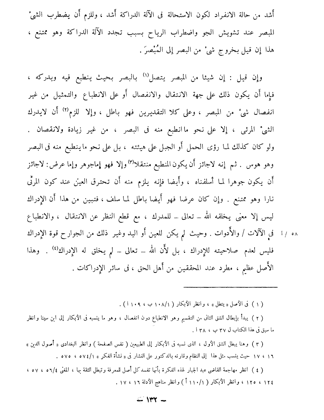 وَإِن قيل إِن شَيْئا من المبصر يتَّصل بالبصر بِحَيْثُ ينطبع فِيهِ ويدركه فإمَّا أَن يكون ذَلِك على جِهَة الِانْتِقَال والانفصال أَو على الانطباع والتمثيل من غير انْفِصَال شئ من المبصر وعَلى كلا التَّقْدِيرَيْنِ فَهُوَ بَاطِل وَإِلَّا للَزِمَ ان لَا يدْرك الشئ المرئى إِلَّا على نَحْو مَا انطبع مِنْهُ فِي الْبَصَر من غير زِيَادَة وَلَا نُقْصَان وَلَو كَانَ كَذَلِك لما رؤى الْحمل أَو الْجَبَل على هَيئته بل على نَحْو مَا ينطبع مِنْهُ فِي الْبَصَر وَهُوَ هوس ثمَّ إِنَّه لَا جَائِز أَن يكون المنطبع منتقلا وَلَا فَهُوَ إِمَّا جَوْهَر وَإِمَّا عرض لَا جَائِز ان يكون جوهرا لما أسلفناه وَأَيْضًا فَإِنَّهُ يلْزم مِنْهُ أَن تحترق الْعين عِنْد كَون المرئى نَارا وَهُوَ مُمْتَنع وَإِن كَانَ عرضا فَهُوَ أَيْضا بَاطِل لما سلف فَتبين من هَذَا أَن الادراك لَيْسَ إِلَّا معنى يخلقه الله تَعَالَى للمدرك مَعَ قطع النطر عَن الِانْتِقَال والانطباع فِي الْآلَات والأدوات وَحَيْثُ لم يكن للعين أَو الْيَد وَغير ذَلِك من الْجَوَارِح قُوَّة الْإِدْرَاك فَلَيْسَ لعدم صلاحيته للإدراك بل لِأَن الله تعإلى لم يخلق لَهُ الْإِدْرَاك وَهَذَا الأصلا عَظِيم مطرد عِنْد الْمُحَقِّقين من أهل الْحق فِي سَائِر الإدراكات