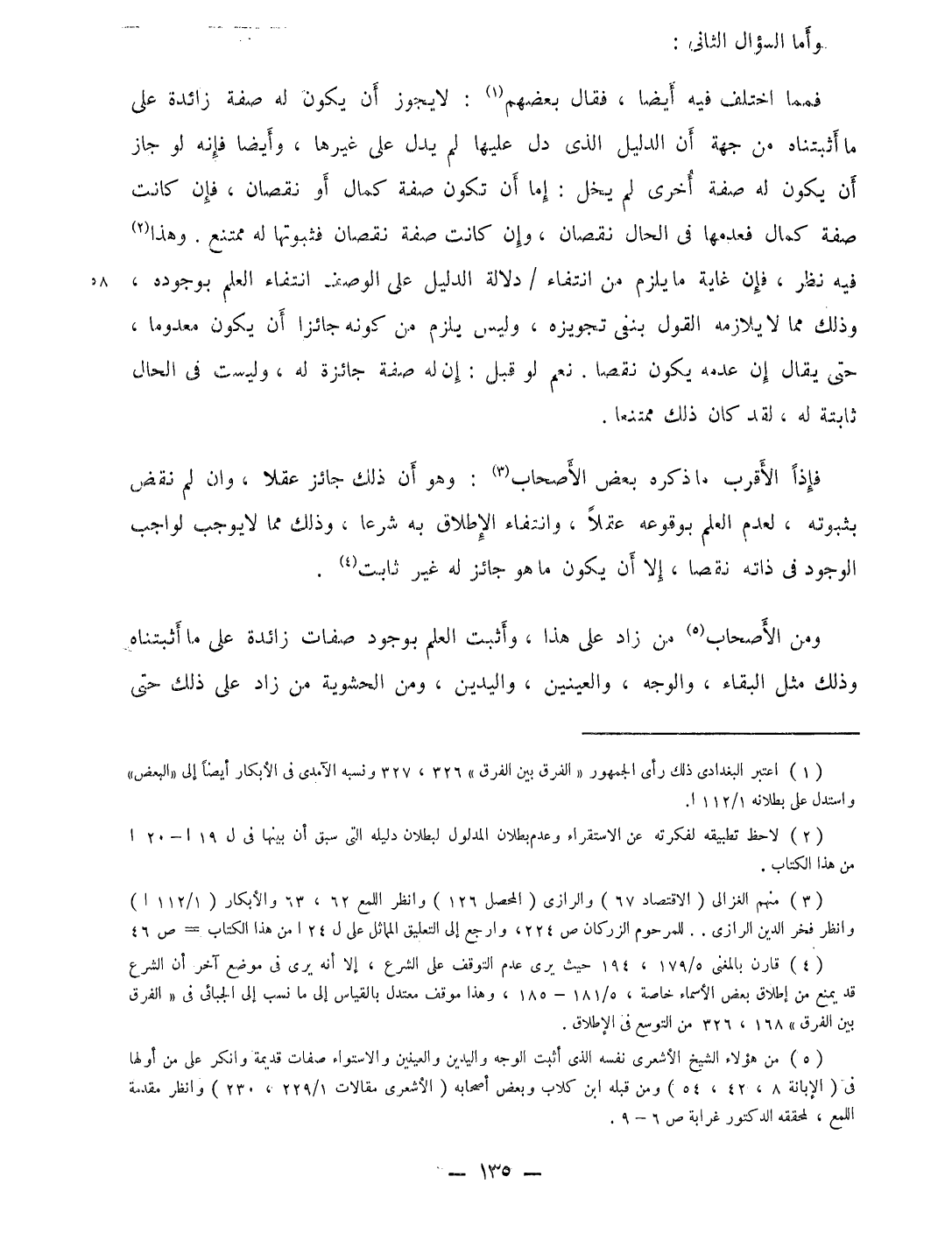 وَمن الْأَصْحَاب من زَاد على هَذَا وَأثبت الْعلم بِوُجُود صِفَات زَائِدَة على مَا أَثْبَتْنَاهُ وَذَلِكَ مثل الْبَقَاء وَالْوَجْه والعينين وَالْيَدَيْنِ وَمن الحشوية من زَاد على ذَلِك حَتَّى