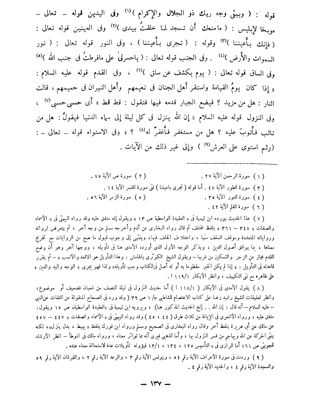 قَوْله {وَيبقى وَجه رَبك ذُو الْجلَال وَالْإِكْرَام} وَفِي الْيَدَيْنِ قَوْله تَعَالَى موبخا لإبليس {مَا مَنعك أَن تسْجد لما خلقت بيَدي} وَفِي الْعَينَيْنِ قَوْله تَعَالَى {فَإنَّك بأعيننا} وَقَوله {تجْرِي بأعيننا} وَفِي النُّور قَوْله تَعَالَى {نور السَّمَاوَات وَالْأَرْض} وَفِي الْجنب قَوْله تَعَالَى {يَا حسرتى على مَا فرطت فِي جنب الله} وَفِي السَّاق قَوْله تَعَالَى {يَوْم يكْشف عَن سَاق} وَفِي الْقدَم قَوْله عَلَيْهِ السَّلَام وَإِذا كَانَ يَوْم الْقِيَامَة وَاسْتقر أهل الْجنان فِي نعيمهم وَأهل النيرَان فِي حميمهم قَالَت النَّار هَل من مزِيد فَيَضَع الْجَبَّار قدمه فِيهَا فَتَقول قطّ قطّ أَي حسبى حسبى وَفِي النُّزُول قَوْله عَلَيْهِ السَّلَام إِن الله ينزل فِي كل لَيْلَة إِلَى سَمَاء الدُّنْيَا فَيَقُول هَل من تائب فأتوب عَلَيْهِ هَل من مُسْتَغْفِر فَأغْفِر لَهُ وَفِي الاسْتوَاء قَوْله تَعَالَى {ثمَّ اسْتَوَى على الْعَرْش} وَإِلَى غير ذَلِك من الْآيَات