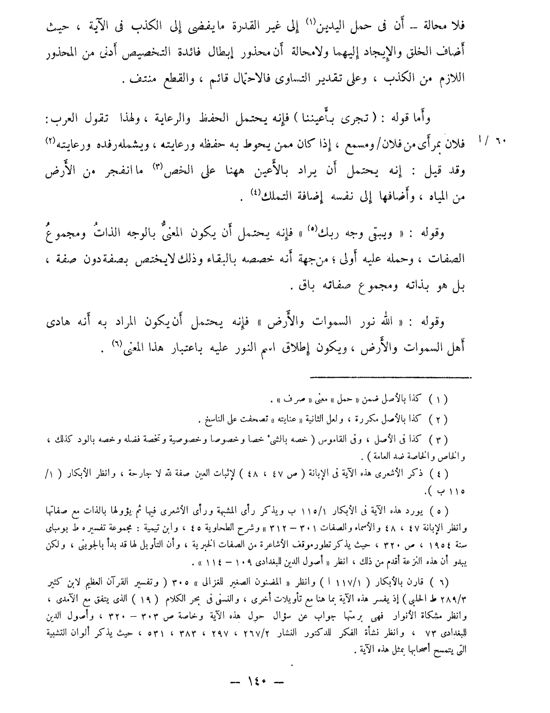 وَأما قَوْله {تجْرِي بأعيننا} فَإِنَّهُ يحْتَمل الْحِفْظ وَالرِّعَايَة وَلِهَذَا تَقول الْعَرَب فلَان بمرأى من فلَان ومسمع إِذا كَانَ مِمَّن يحوط بِهِ حفظه ورعايته ويشمله رفده ورعايته وَقد قيل إِنَّه يحْتَمل أَن يُرَاد بالأعين هَهُنَا على الخص مَا انفجر من الأَرْض من الْمِيَاه وأضافها إِلَى نَفسه إِضَافَة التَّمَلُّك