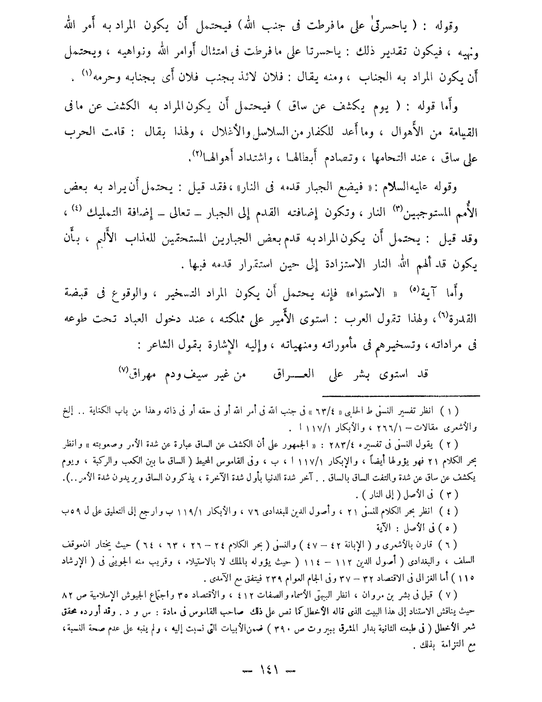 وَأما آيَة الاسْتوَاء فَإِنَّهُ يحْتَمل أَن يكون المُرَاد التسخير والوقوع فِي قَبْضَة الْقُدْرَة وَلِهَذَا تَقول الْعَرَب اسْتَوَى الْأَمِير على مَمْلَكَته عِنْد دُخُول الْعباد تَحت طوعه فِي مراداته وتسخيرهم فِي مأموراته ومنهياته وَإِلَيْهِ الْإِشَارَة بقول الشَّاعِر ... قد اسْتَوَى بشر على الْعرَاق ... من غير سيف وَدم مهراق ...
