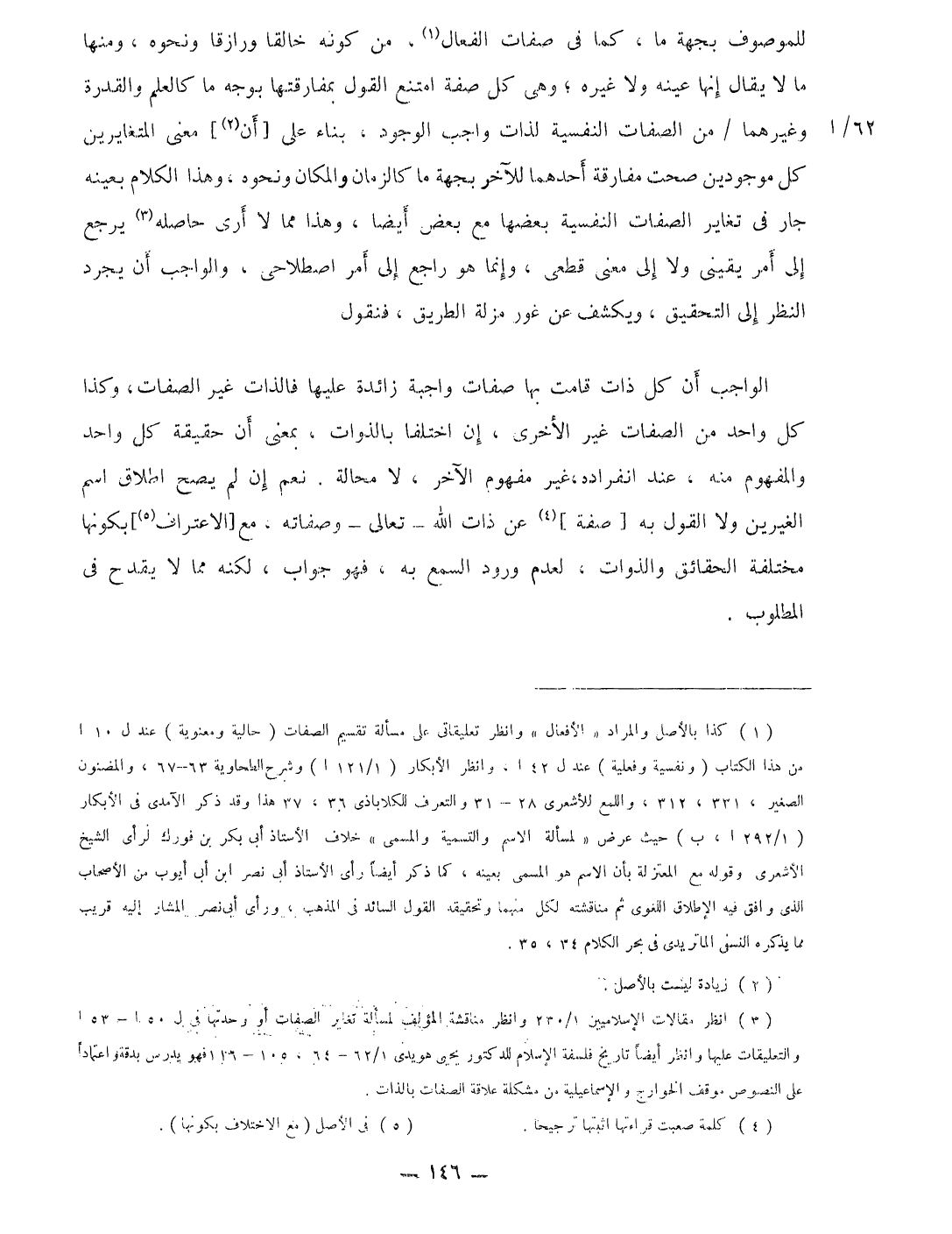 للموصوف بِجِهَة مَا كَمَا فِي صِفَات الفعال من كَونه خَالِقًا ورازقا وَنَحْوه وَمِنْهَا مَا لَا يُقَال إِنَّهَا عينه وَلَا غَيره وهى كل صفة امْتنع القَوْل بمفارقتها بِوَجْه مَا كَالْعلمِ وَالْقُدْرَة وَغَيرهمَا من الصِّفَات النفسية لذات وَاجِب الْوُجُود بِنَاء على أَن معنى المتغايرين كل موجودين صحت مُفَارقَة أَحدهمَا للْآخر بِجِهَة مَا كالزمان وَالْمَكَان وَنَحْوه وَهَذَا الْكَلَام بِعَيْنِه جَار فِي تغاير الصِّفَات النفسية بَعْضهَا مَعَ بعض أَيْضا وَهَذَا مِمَّا لَا أرى حَاصله يرجع إِلَى أَمر يقينى وَلَا إِلَى معنى قطعى وَإِنَّمَا هُوَ رَاجع إِلَى أَمر اصطلاحى وَالْوَاجِب أَن يجرد النّظر إِلَى التَّحْقِيق ويكشف عَن غور مزلة الطَّرِيق فَنَقُول