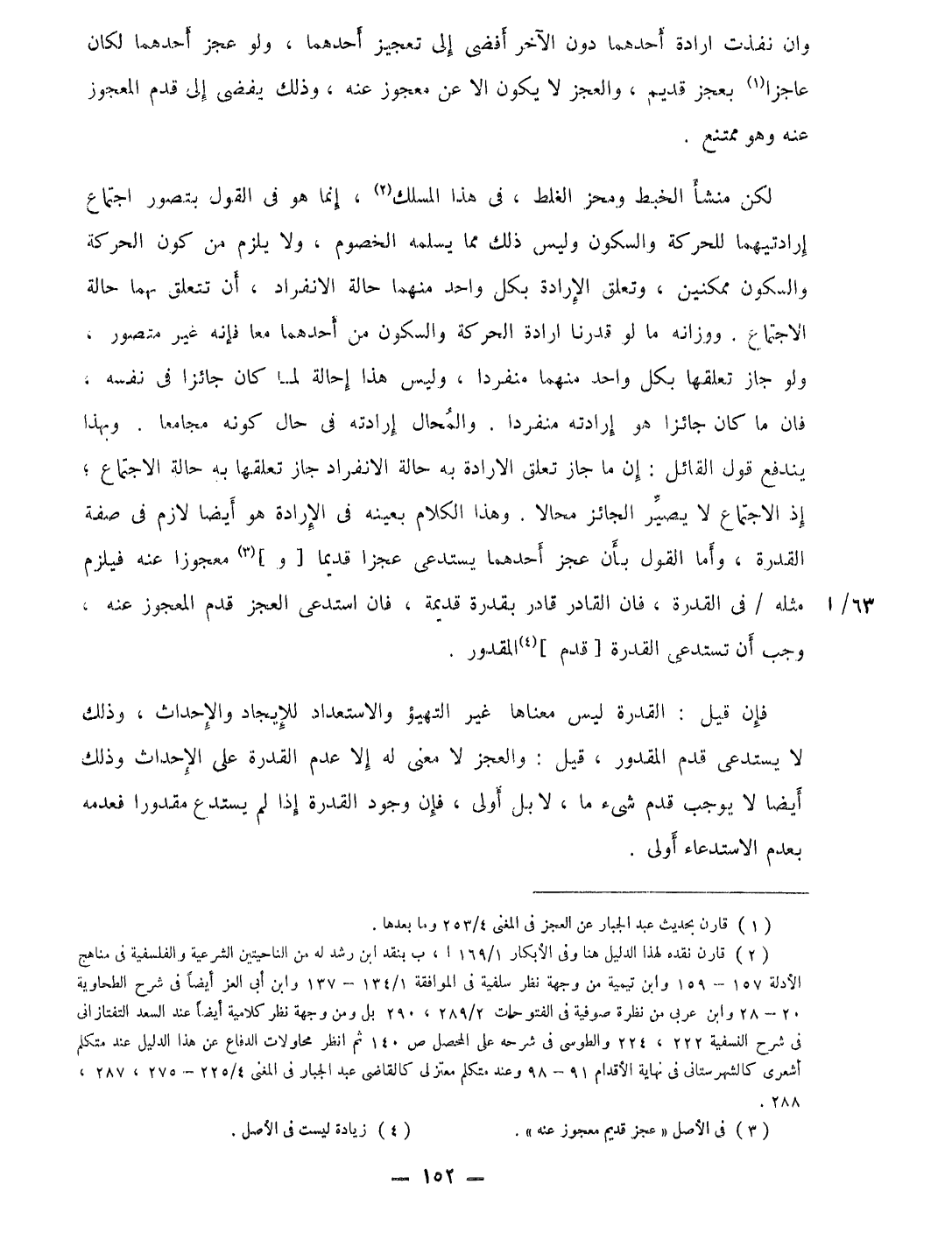 لَكِن منشأ الْخبط ومحز الْغَلَط فِي هَذَا المسلك إِنَّمَا هُوَ فِي القَوْل بتصور اجْتِمَاع إرادتيهما للحركة وَلَيْسَ ذَلِك مِمَّا يُسلمهُ الْخُصُوم وَلَا يلْزم من كَون الْحَرَكَة والسكون ممكنين وَتعلق الْإِرَادَة بِكُل وَاحِد مِنْهُمَا حَالَة الِانْفِرَاد أَن تتَعَلَّق بهما حَالَة الِاجْتِمَاع ووزانه مَا لَو قَدرنَا ارادة الْحَرَكَة والسكون من أَحدهمَا مَعًا فَإِنَّهُ غير مُتَصَوّر وَلَو جَازَ تعلقهَا بِكُل وَاحِد مِنْهُمَا مُنْفَردا وَلَيْسَ هَذَا إِحَالَة لما كَانَ جَائِزا فِي نَفسه فان مَا كَانَ جَائِزا هُوَ إِرَادَته مُنْفَردا والمحال إِرَادَته فِي حَال كَونه مجامعا وَبِهَذَا ينْدَفع قَول الْقَائِل إِن مَا جَازَ تعلق الارادة بِهِ حَالَة الِانْفِرَاد جَازَ تعلقهَا بِهِ حَالَة الِاجْتِمَاع إِذْ الِاجْتِمَاع لَا يصير الْجَائِز محالا وَهَذَا الْكَلَام بِعَيْنِه فِي الْإِرَادَة هُوَ أَيْضا لَازم فِي صفة الْقُدْرَة وَأما القَوْل بِأَن عجز احدهما يستدعى عَجزا قَدِيما (و) معجوزا عَنهُ فَيلْزم مثله فِي الْقُدْرَة فَإِن الْقَادِر قَادر بقدرة قديمَة فَإِن استدعى الْعَجز قدم المعجوز عَنهُ وَجب أَن تستدعى الْقُدْرَة قدم الْمَقْدُور