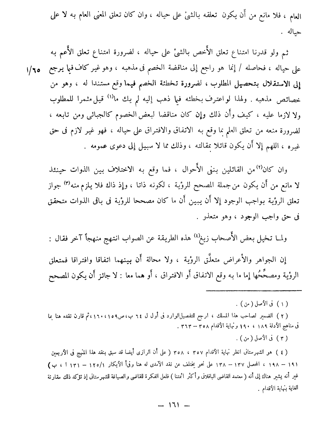 ثمَّ وَلَو قَدرنَا امْتنَاع تعلق الاخص بالشئ على حياله لضَرُورَة امْتنَاع تعلق الْأَعَمّ بِهِ على حياله فحاصله إِنَّمَا هُوَ رَاجع إِلَى مناقضة الْخصم فِي مذْهبه وَهُوَ غير كَاف فِيمَا يرجع إِلَى الِاسْتِقْلَال بتحصيل الْمَطْلُوب لضَرُورَة تخطئة الْخصم فِيمَا وَقع مُسْتَندا لَهُ وَهُوَ من خَصَائِص مذْهبه وَلِهَذَا لَو اعْترف بخطئه فِيمَا ذهب إِلَيْهِ لم يَك مَا قيل مثمرا للمطلوب وَلَا لَازِما عَلَيْهِ كَيفَ وَأَن ذَلِك وَإِن كَانَ مناقضا لبَعض الْخُصُوم كالجبائى وَمن تَابعه لضَرُورَة مَنعه من تعلق الْعلم بِمَا وَقع بِهِ الِاتِّفَاق والافتراق على حياله فَهُوَ غير لَازم فِي حق غَيره اللَّهُمَّ إِلَّا أَن يكون قَائِلا بمقالته وَذَلِكَ مِمَّا لَا سَبِيل إِلَى دَعْوَى عُمُومه
