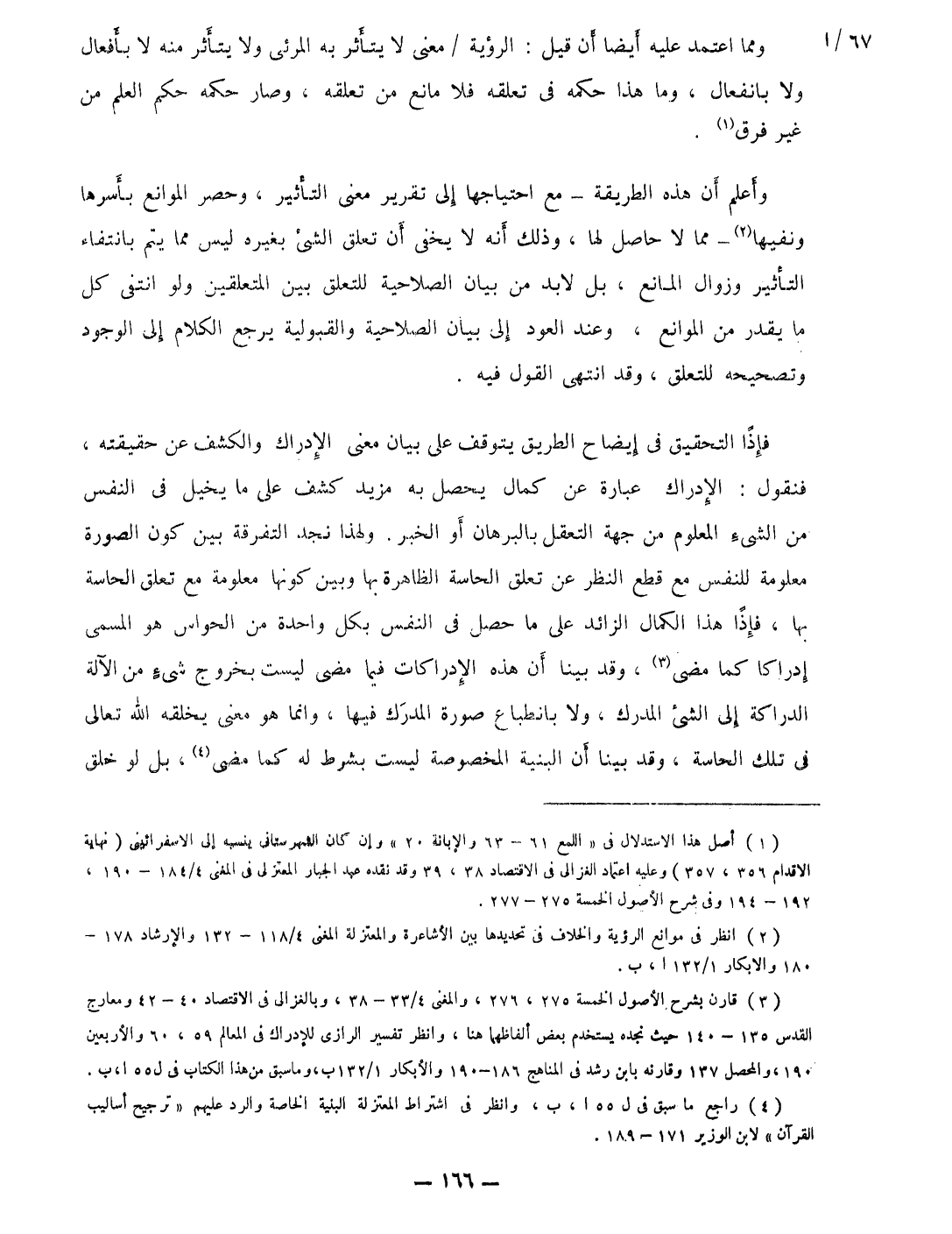 فَإِذا التَّحْقِيق فِي إِيضَاح الطَّرِيق يتَوَقَّف على بَيَان معنى الْإِدْرَاك والكشف عَن حَقِيقَته فَنَقُول الْإِدْرَاك عبارَة عَن كَمَال يحصل بِهِ مزِيد كشف على مَا يخيل فِي النَّفس من الشئ الْمَعْلُوم من جِهَة التعقل بالبرهان أَو الْخَبَر وَلِهَذَا نجد التَّفْرِقَة بَين كَون الصُّورَة مَعْلُومَة للنَّفس مَعَ قطع النّظر عَن تعلق الحاسة الظَّاهِرَة بهَا وَبَين كَونهَا مَعْلُومَة مَعَ تعلق الحاسة بهَا فَإِذا هَذَا الْكَمَال الزَّائِد على مَا حصل فِي النَّفس بِكُل وَاحِدَة من الْحَواس هُوَ الْمُسَمّى إدراكا كَمَا مضى وَقد بَينا أَن هَذِه الإدراكات فِيمَا مضى لَيست بِخُرُوج شئ من الْآلَة الدراكة إِلَى الشئ الْمدْرك وَلَا بانطباع صُورَة الْمدْرك فِيهَا وانما هُوَ معنى يخلقه الله تَعَالَى فِي تِلْكَ الحاسة وَقد بَينا أَن البنية الْمَخْصُوصَة لَيست بِشَرْط لَهُ كَمَا مضى بل لَو خلق