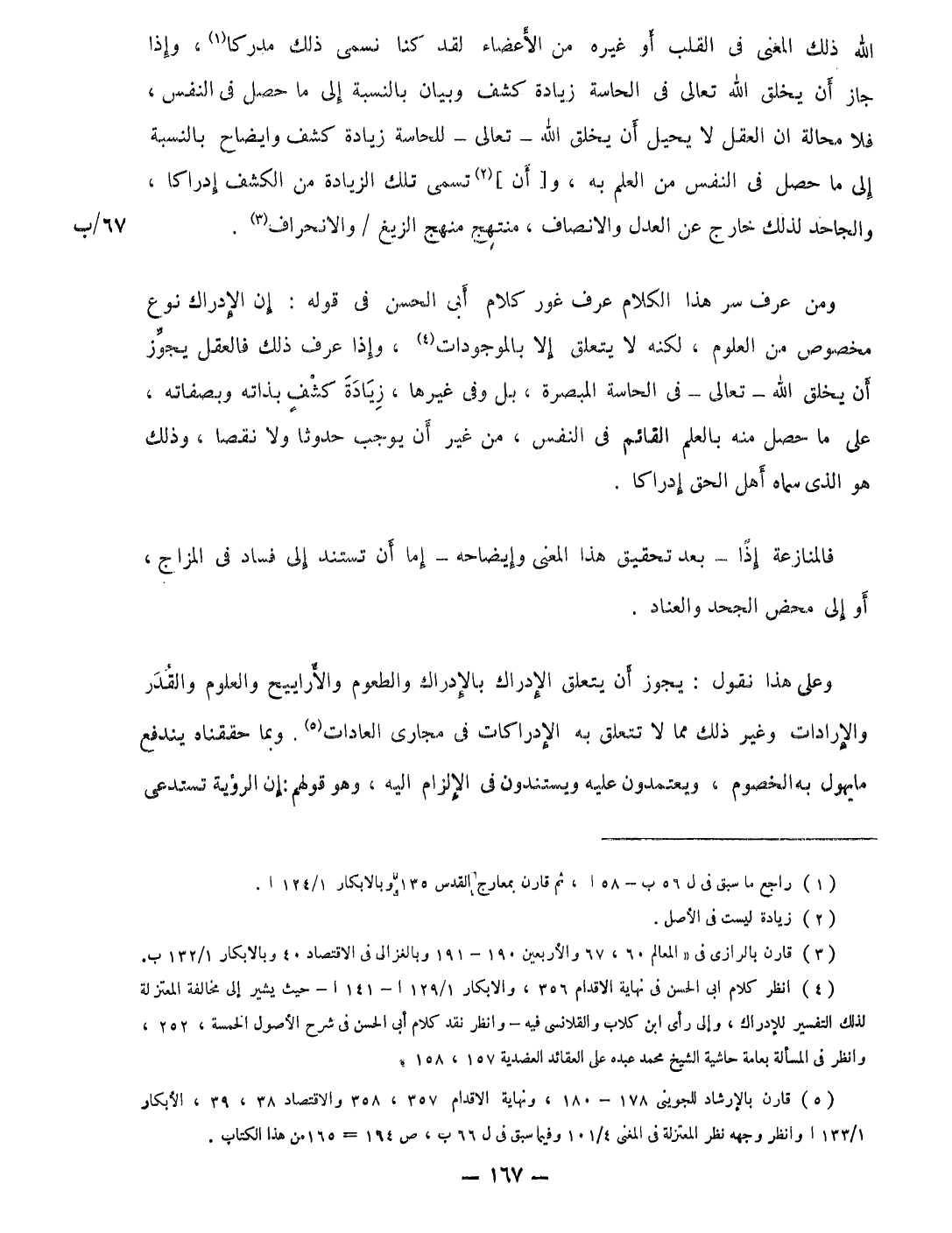 الله ذَلِك الْمَعْنى فِي الْقلب أَو غَيره من الْأَعْضَاء لقد كُنَّا نسمى ذَلِك مدْركا وَإِذا جَازَ أَن يخلق الله تَعَالَى فِي الحاسة زِيَادَة كشف وَبَيَان بِالنِّسْبَةِ إِلَى مَا حصل فِي النَّفس فَلَا محَالة ان الْعقل لَا يحِيل أَن يخلق الله تَعَالَى للحاسة زِيَادَة كشف وايضاح بِالنِّسْبَةِ إِلَى مَا حصل فِي النَّفس من الْعلم بِهِ وَأَن تسمى تِلْكَ الزِّيَادَة من الْكَشْف إدراكا والجاحد لذَلِك خَارج عَن الْعدْل والانصاف منتهج مَنْهَج الزيغ والإنحراف