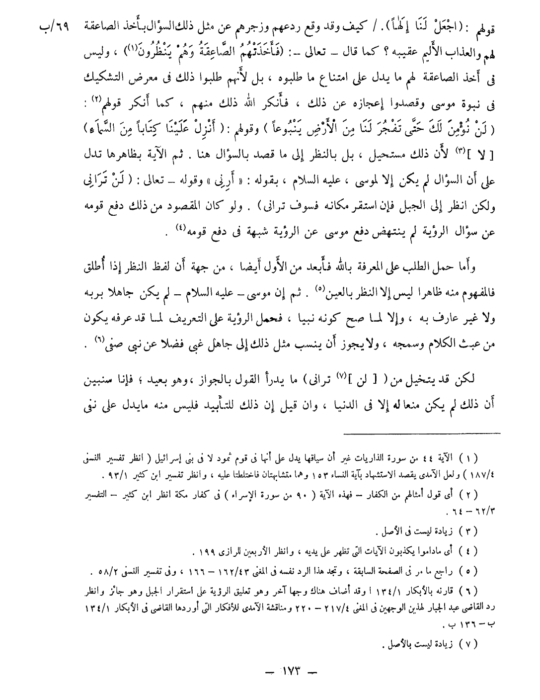وَأما حمل الطّلب على الْمعرفَة بِاللَّه فأبعد من الأول أَيْضا من جِهَة أَن لفظ النّظر إِذا أطلق فالمفهوم مِنْهُ ظَاهرا لَيْسَ إِلَّا النّظر بِالْعينِ ثمَّ إِن مُوسَى عَلَيْهِ السَّلَام لم يكن جَاهِلا بربه وَلَا غير عَارِف بِهِ وَإِلَّا لما صَحَّ كَونه نَبيا فَحمل الرُّؤْيَة على التَّعْرِيف لما قد عرفه يكون من عَبث الْكَلَام وسمجه وَلَا يجوز أَن ينْسب مثل ذَلِك إِلَى جَاهِل غبى فضلا عَن نبى صفى