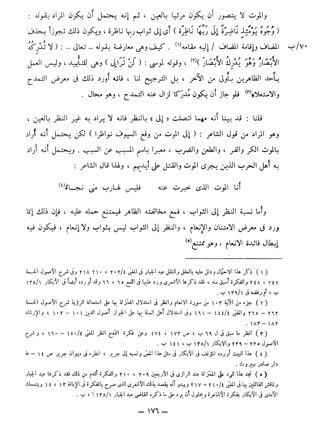 قُلْنَا قد بَينا أَنه مهما اتَّصَلت إِلَى بِالنّظرِ فَإِنَّهُ لَا يُرَاد بِهِ غير النّظر بِالْعينِ هُوَ المُرَاد من قَول الشَّاعِر ... إِلَى الْمَوْت من وَقع السيوف نواظرا ...
