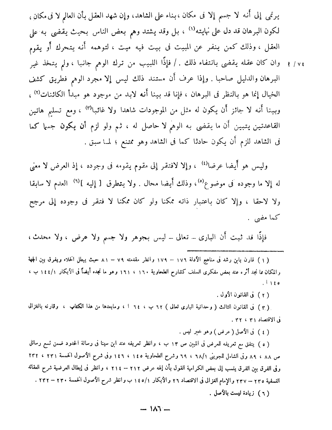 يرتمى إِلَى أَنه لَا جسم إِلَّا فِي مَكَان بِنَاء على الشَّاهِد وَإِن شهد الْعقل بِأَن الْعَالم لَا فِي مَكَان لكَون الْبُرْهَان قد دلّ على نهايته بل وَقد يشْتَد وهم بعض النَّاس بِحَيْثُ يقْضى بِهِ على الْعقل وَذَلِكَ كمن ينفر عَن الْمبيت فِي بَيت فِيهِ ميت لتوهمه أَنه يَتَحَرَّك أَو يقوم وان كَانَ عقله يقْضى بانتقاء ذَلِك فَإِذا اللبيب من ترك الْوَهم جانبا وَلم يتَّخذ غير الْبُرْهَان وَالدَّلِيل صاحبا وَإِذا عرف أَن مُسْتَند ذَلِك لَيْسَ إِلَّا مُجَرّد الْوَهم فطريق كشف الخيال إِنَّمَا هُوَ بِالنّظرِ فِي الْبُرْهَان فَإنَّا قد بَينا أَنه لَا بُد من مَوْجُود هُوَ مبدأ الكائنات وَبينا أَنه لَا جَائِز أَن يكون لَهُ مثل من الموجودات شَاهدا وَلَا غَائِبا وَمَعَ تَسْلِيم هَاتين القاعدتين يتَبَيَّن أَن مَا يفضى بِهِ الْوَهم لَا حَاصِل لَهُ ثمَّ وَلَو لزم أَن يكون جسما كَمَا فِي الشَّاهِد للَزِمَ أَن يكون حَادِثا كَمَا فِي الشَّاهِد وَهُوَ مُمْتَنع لما سبق