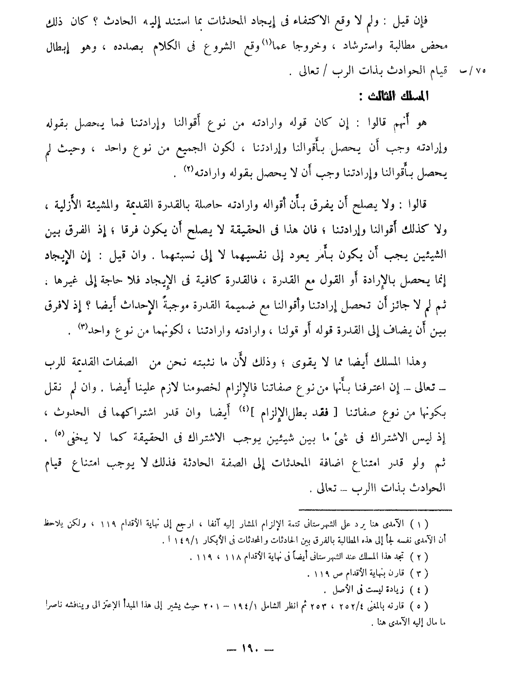 وَهَذَا المسلك أَيْضا مِمَّا لَا يقوى وَذَلِكَ لِأَن مَا نثبته نَحن من الصِّفَات الْقَدِيمَة للرب تَعَالَى إِن اعترفنا بِأَنَّهَا من نوع صفاتنا فالإلزام لخصومنا لَازم علينا أَيْضا وان لم نقل بِكَوْنِهَا من نوع صفاتنا فقد بَطل الْإِلْزَام أَيْضا وان قدر اشتراكهما فِي الْحُدُوث إِذْ لَيْسَ الِاشْتِرَاك فِي شئ مَا بَين شَيْئَيْنِ يُوجب الِاشْتِرَاك فِي الْحَقِيقَة كَمَا لَا يخفى ثمَّ وَلَو قدر امْتنَاع اضافة المحدثات إِلَى الصّفة الْحَادِثَة فَذَلِك لَا يُوجب امْتنَاع قيام الْحَوَادِث بِذَات الرب تَعَالَى