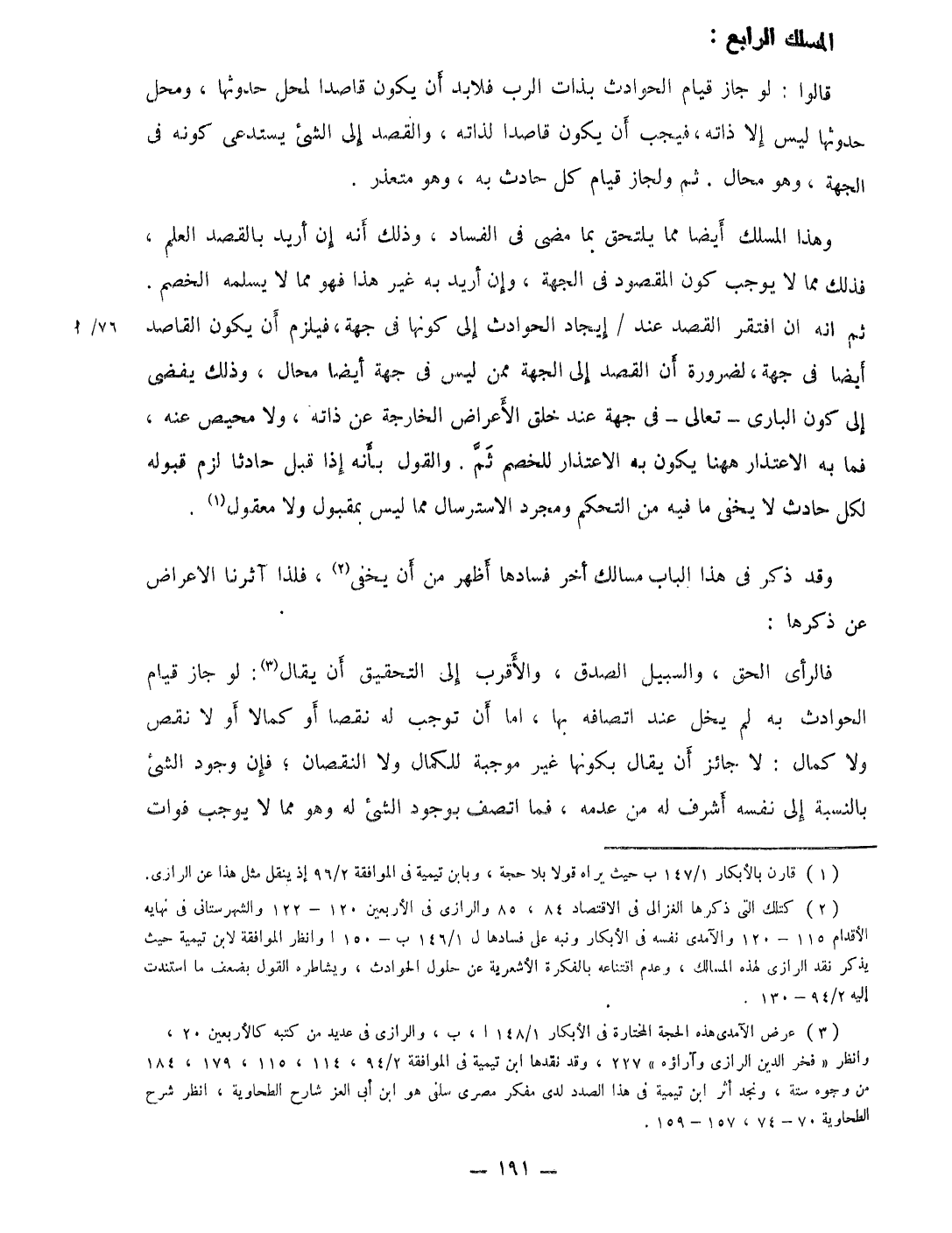 وَهَذَا المسلك أَيْضا مِمَّا يلْتَحق بِمَا مضى فِي الْفساد وَذَلِكَ أَنه إِن أُرِيد بِالْقَصْدِ الْعلم فَذَلِك مِمَّا لَا يُوجب كَون الْمَقْصُود فِي الْجِهَة وَإِن أُرِيد بِهِ غير هَذَا فَهُوَ مِمَّا لَا يُسلمهُ الْخصم ثمَّ انه ان افْتقر الْقَصْد عِنْد إِيجَاد الْحَوَادِث إِلَى كَونهَا فِي جِهَة فَيلْزم أَن يكون القاصد أَيْضا فِي جِهَة لضَرُورَة ان الْقَصْد إِلَى الْجِهَة مِمَّن لَيْسَ فِي جِهَة أَيْضا محَال وَذَلِكَ يفضى إِلَى كَون البارى تَعَالَى فِي جِهَة عِنْد خلق الْأَعْرَاض الْخَارِجَة عَن ذَاته وَلَا محيص عَنهُ فَمَا بِهِ الِاعْتِذَار هَهُنَا يكون بِهِ الِاعْتِذَار للخصم ثمَّ وَالْقَوْل بِأَنَّهُ إِذا قيل حَادِثا لزم قبُوله لكل حَادث لَا يخفى مَا فِيهِ من التحكم وَمُجَرَّد الاسترسال مِمَّا لَيْسَ بمقبول وَلَا مَعْقُول