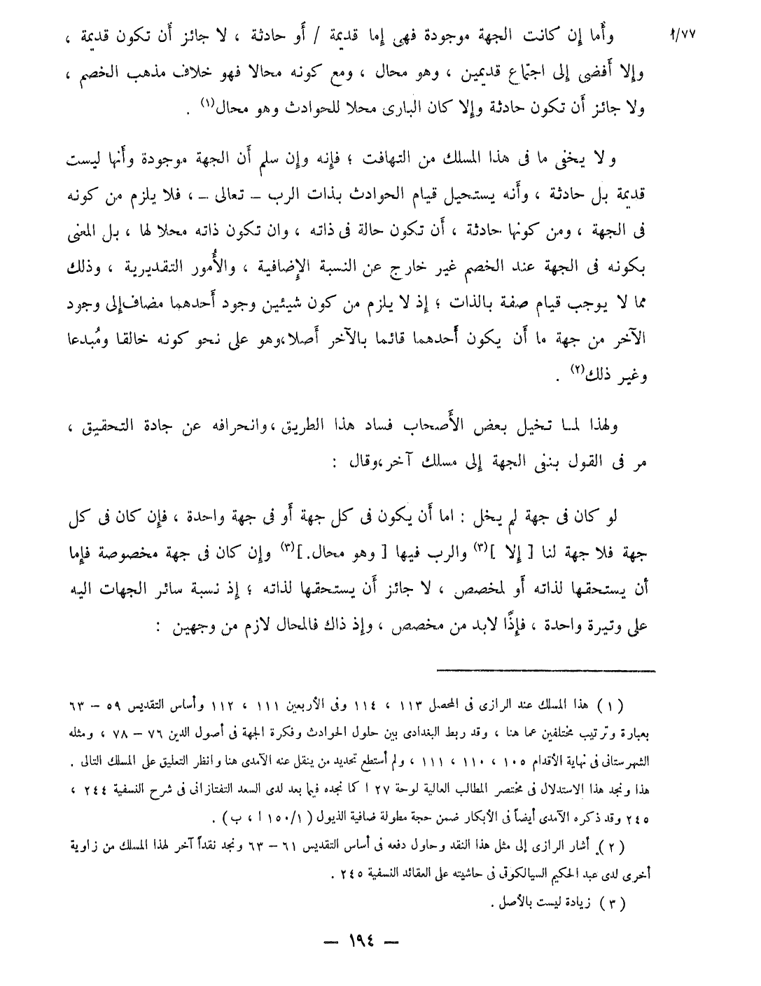 وَلَا يخفى مَا فِي هَذَا المسلك من التهافت فَإِنَّهُ وَإِن سلم أَن الْجِهَة مَوْجُودَة وانها لَيست قديمَة بل حَادِثَة وانه يَسْتَحِيل قيام الْحَوَادِث بِذَات الرب تَعَالَى فَلَا يلْزم من كَونه فِي الْجِهَة وَمن كَونهَا حَادِثَة ان تكون حَالَة فِي ذَاته وان تكون ذَاته محلا لَهَا بل الْمَعْنى بِكَوْنِهِ فِي الْجِهَة عِنْد الْخصم غير خَارج عَن النِّسْبَة الإضافية والأمور التقديرية وَذَلِكَ مِمَّا لَا يُوجب قيام صفة بِالذَّاتِ إِذْ لَا يلْزم من كَون شَيْئَيْنِ وجود أَحدهمَا مُضَاف إِلَى وجود الآخر من جِهَة مَا أَن يكون أَحدهمَا قَائِما بِالْآخرِ أصلا وَهُوَ على نَحْو كَونه خَالِقًا ومبدعا وَغير ذَلِك
