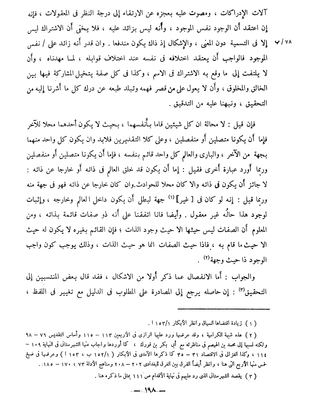 فَإِن قيل لَا محَالة ان كل شَيْئَيْنِ قاما بانفسهما بِحَيْثُ لَا يكون احدهما محلا للْآخر فإمَّا ان يَكُونَا متصلين أَو منفصلين وعَلى كلا التَّقْدِيرَيْنِ فَلَا بُد وان يكون كل وَاحِد مِنْهُمَا بِجِهَة من الآخر والبارى والعالم كل وَاحِد قَائِم بِنَفسِهِ فإمَّا أَن يَكُونَا متصلين أَو منفصلين وَرُبمَا أورد عبارَة أُخْرَى فَقيل إِمَّا أَن يكون قد خلق الْعَالم فِي ذَاته أَو خَارِجا عَن ذَاته لَا جَائِز أَن يكون فِي ذَاته والا كَانَ محالا للحوادث وان كَانَ خَارِجا عَن ذَاته فَهُوَ فِي جِهَة مِنْهُ وَرُبمَا قيل إِنَّه لَو كَانَ فِي غير جِهَة لبطل أَن يكون دَاخل الْعَالم وخارجه وَإِثْبَات لوُجُود هَذَا حَاله غير مَعْقُول وَأَيْضًا فَإنَّا اتفقنا على أَنه ذُو صِفَات قَائِمَة بِذَاتِهِ وَمن الْمَعْلُوم أَن الصِّفَات لَيْسَ حيثها الا حَيْثُ وجود الذَّات فَإِن الْقَائِم بِغَيْرِهِ لَا يكون لَهُ حَيْثُ الا حَيْثُ مَا قَامَ بِهِ فاذا حَيْثُ الصِّفَات انما هُوَ حَيْثُ الذَّات وَذَلِكَ يُوجب كَون وَاجِب الْوُجُود ذ ذَا حَيْثُ وجهة
