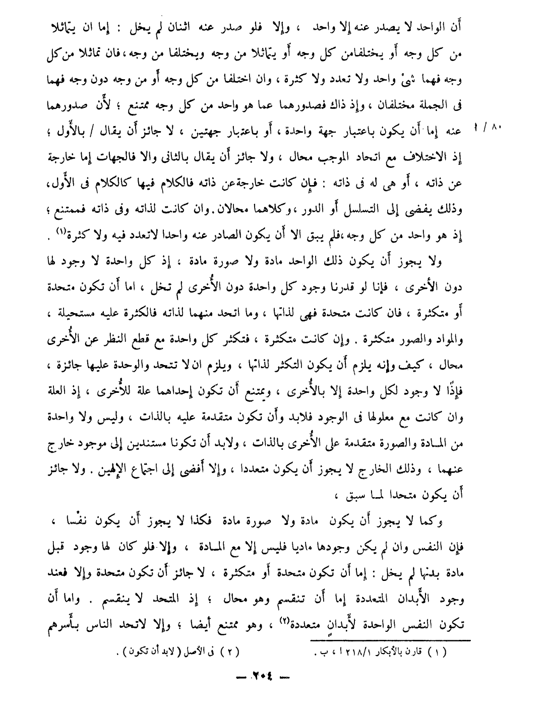وَلَا يجوز ان يكون ذَلِك الْوَاحِد مَادَّة وَلَا صُورَة مَادَّة إِذْ كل وَاحِدَة لَا وجود لَهَا دون الْأُخْرَى فَإنَّا لَو قَدرنَا وجود كل وَاحِدَة دون الْأُخْرَى لم تخل اما أَن تكون متحدة أَو متكثرة فان كَانَت متحدة فهى لذاتها وَمَا اتَّحد مِنْهُمَا لذاته فالكثرة عَلَيْهِ مستحيلة والمواد والصور متكثرة وَإِن كَانَت متكثرة فتكثر كل وَاحِدَة مَعَ قطع النّظر عَن الْأُخْرَى محَال كَيفَ وَإنَّهُ يلْزم أَن يكون التكثر لذاتها وَيلْزم ان لَا تتحد والوحدة عَلَيْهَا جَائِزَة فَإِذا لَا وجود لكل وَاحِدَة إِلَّا بِالْأُخْرَى وَيمْتَنع ان تكون إِحْدَاهمَا عله لِلْأُخْرَى إِذْ الْعلَّة وان كَانَت مَعَ معلولها فِي الْوُجُود فَلَا بُد وان تكون مُتَقَدّمَة عَلَيْهِ بِالذَّاتِ وَلَيْسَ وَلَا وَاحِدَة من الْمَادَّة وَالصُّورَة مُتَقَدّمَة على الْأُخْرَى بِالذَّاتِ وَلَا بُد ان تَكُونَا مستندين إِلَى مَوْجُود خَارج عَنْهُمَا وَذَلِكَ الْخَارِج لَا يجوز ان يكون مُتَعَددًا وَإِلَّا أفْضى إِلَى اجْتِمَاع الإلهين وَلَا جَائِز أَن يكون متحدا لما سبق