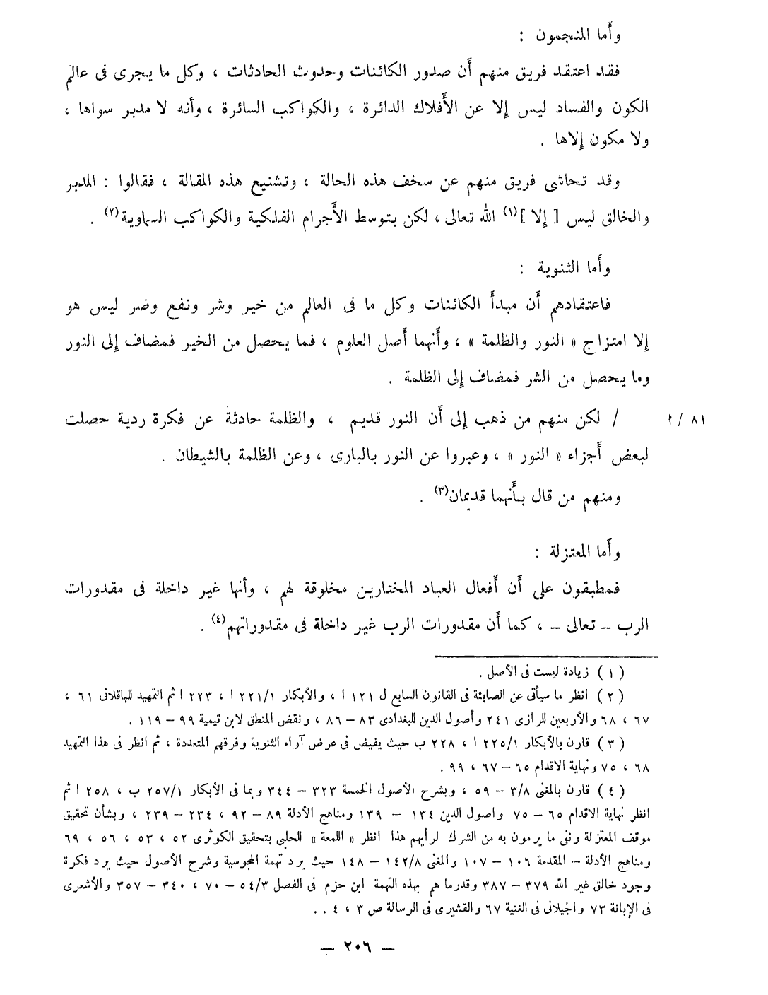لَكِن مِنْهُم من ذهب إِلَى أَن النُّور قديم والظلمة حَادِثَة عَن فكرة ردية حصلت لبَعض أَجزَاء النُّور وعبروا عَن النُّور بالبارى وَعَن الظملة بالشيطان