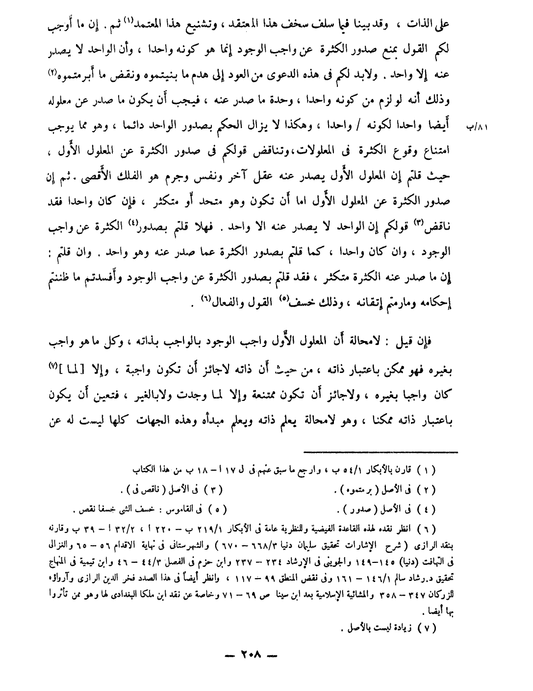 فَإِن قيل لَا محَالة أَن الْمَعْلُول الاول وَاجِب الْوُجُود بِالْوَاجِبِ بِذَاتِهِ وكل مَا هُوَ وَاجِب بِغَيْرِهِ فَهُوَ مُمكن باعبتار ذَاته من حَيْثُ أَن ذَاته لَا جَائِز أَن تكون وَاجِبَة وَإِلَّا لما كن وَاجِبا بِغَيْرِهِ وَلَا جَائِز أَن تكون ممتنعة وَإِلَّا لما وجدت وَلَا بِالْغَيْر فَتعين أَن يكون بِاعْتِبَار ذَاته مُمكنا وَهُوَ لَا محَالة يعلم ذَاته وَيعلم مبدأه وَهَذِه الْجِهَات كلهَا لَيست لَهُ عَن