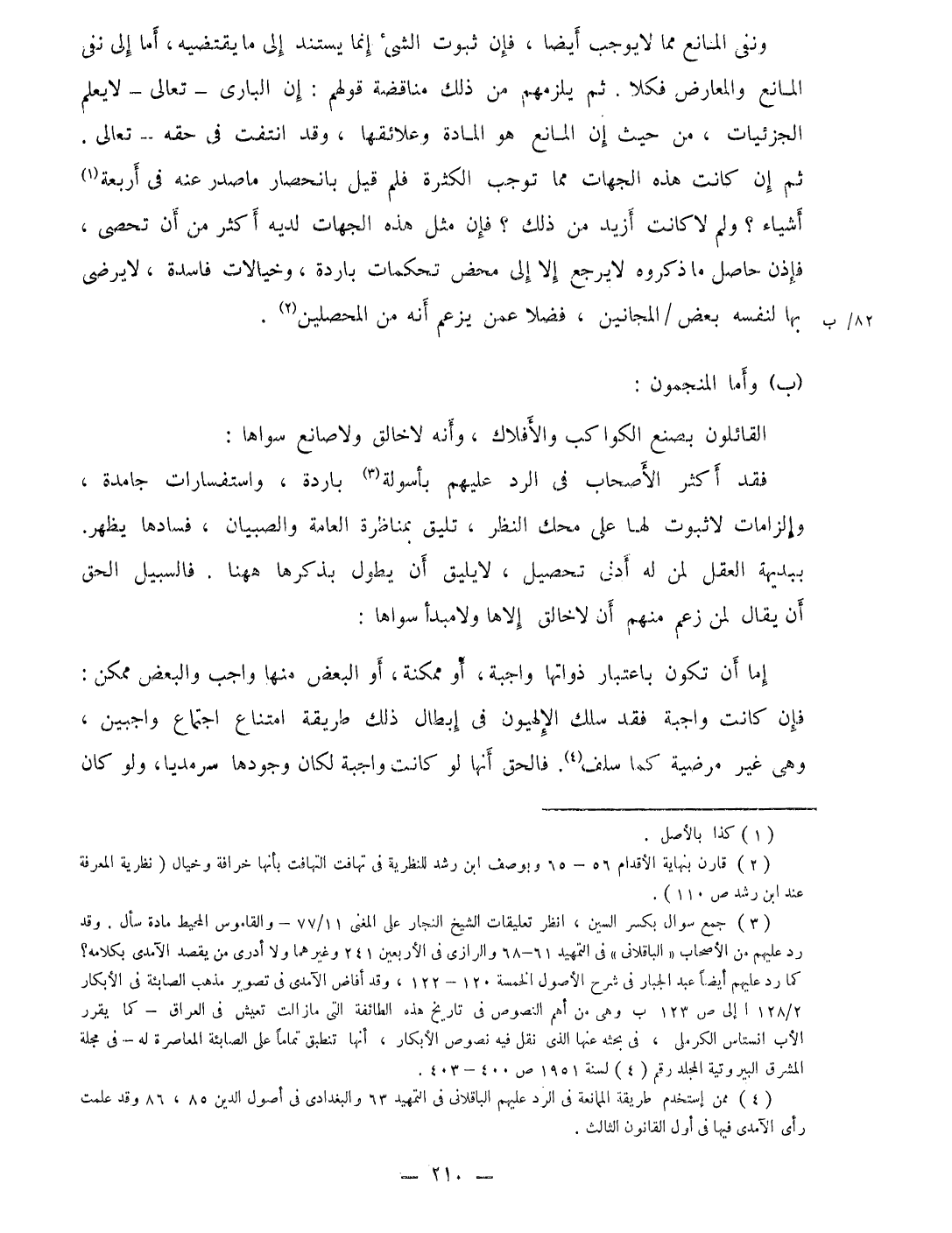 إِمَّا أَن تكون بِاعْتِبَار ذواتها وَاجِبَة أَو مُمكنَة أَو الْبَعْض مِنْهَا وَاجِب وَالْبَعْض مُمكن فَإِن كَانَت وَاجِبَة فقد سلك الإلهيون فِي إبِْطَال ذَلِك طَريقَة امْتنَاع اجْتِمَاع واجبين وهى غير مرضية كَمَا سلف فَالْحق أَنَّهَا لَو كَانَت وَاجِبَة لَكَانَ وجودهَا سرمديا وَلَو كَانَ